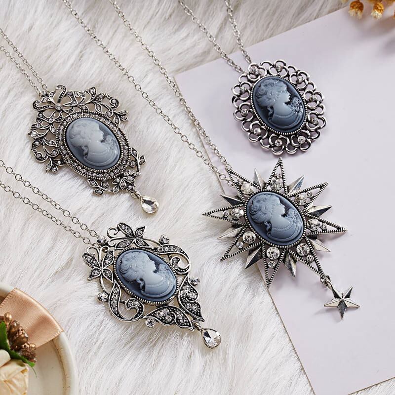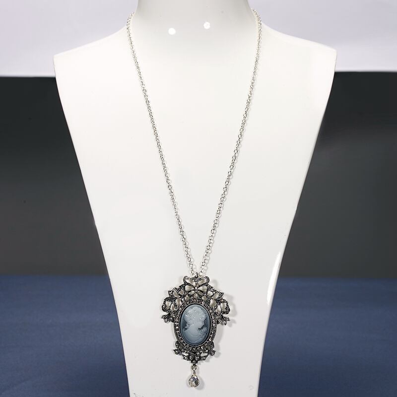 送料無料 ヴィンテージビューティーポートレートロングセーターチェーンレディースネックレスオーバルレジンペンダントレディシルバーカラーチョーカーバロックジュエリー レース 銀 ビンテージ アクセサリー AE777882372859531