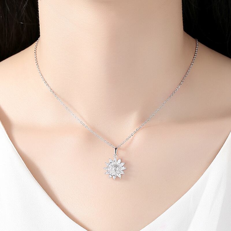 送料無料 繊細なジルコンひまわり女性ネックレスフラワーペンダントシルバーカラー鎖骨チェーンガールフレンドジュエリーパーティーウェディングチャームギフト レース フラワーデザイン 銀 アクセサリー AE777881062445773