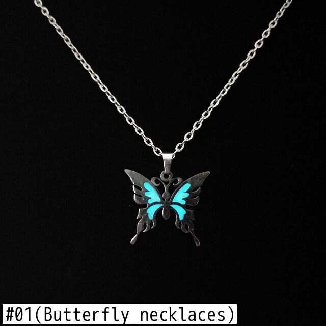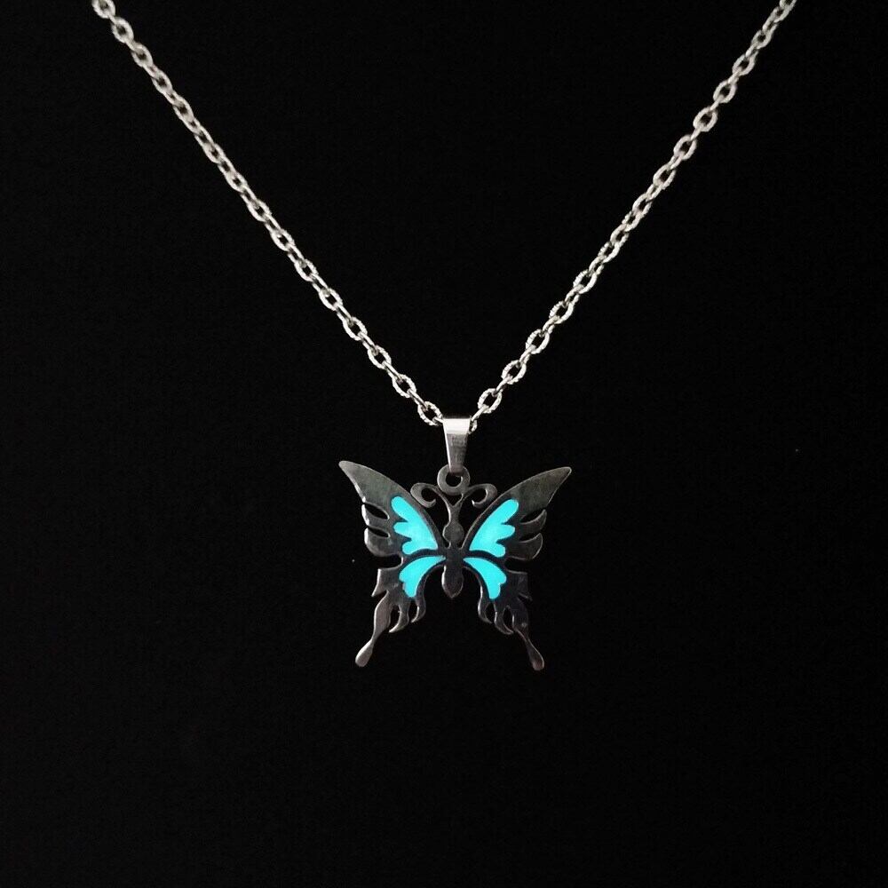 送料無料 クリエイティブな輝くバタフライペンダントネックレス女性ステンレススチールチェーンルミナスチョーカー男性ジュエリーギフト レース アクセサリー AE7778857220626948