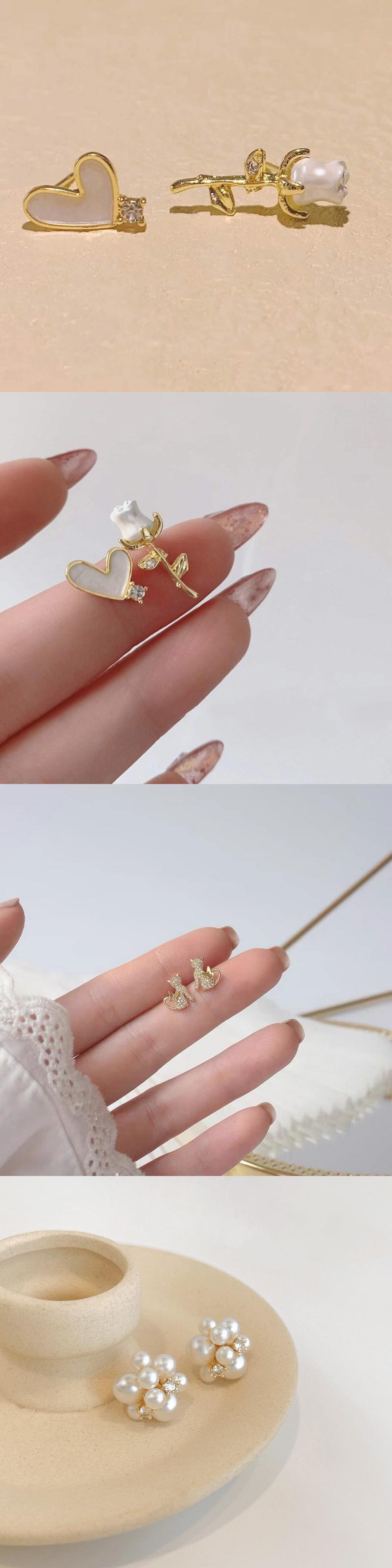 送料無料 レトロ非対称ハートローズフラワースタッドピアス女性気質イミテーションパールピアスジュエリー イヤリング 真珠 リング 指輪 フラワーデザイン アクセサリー AE1777768166261870