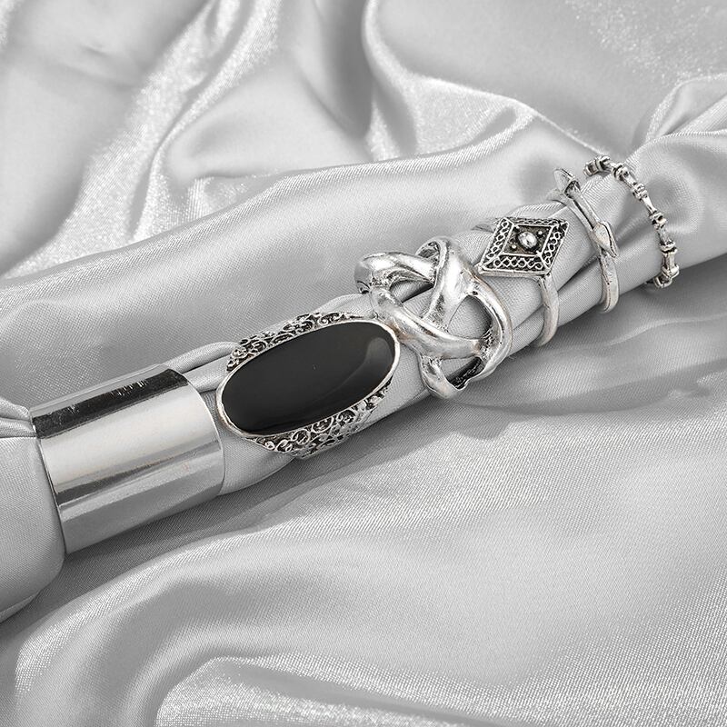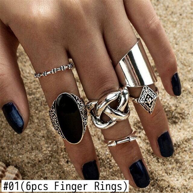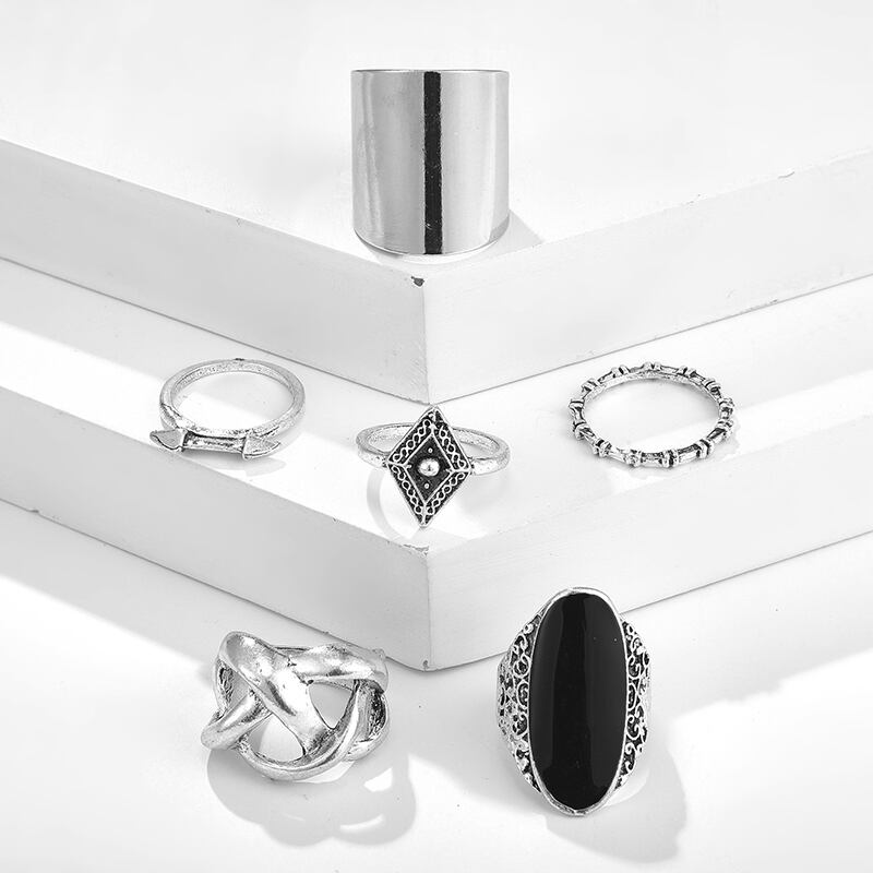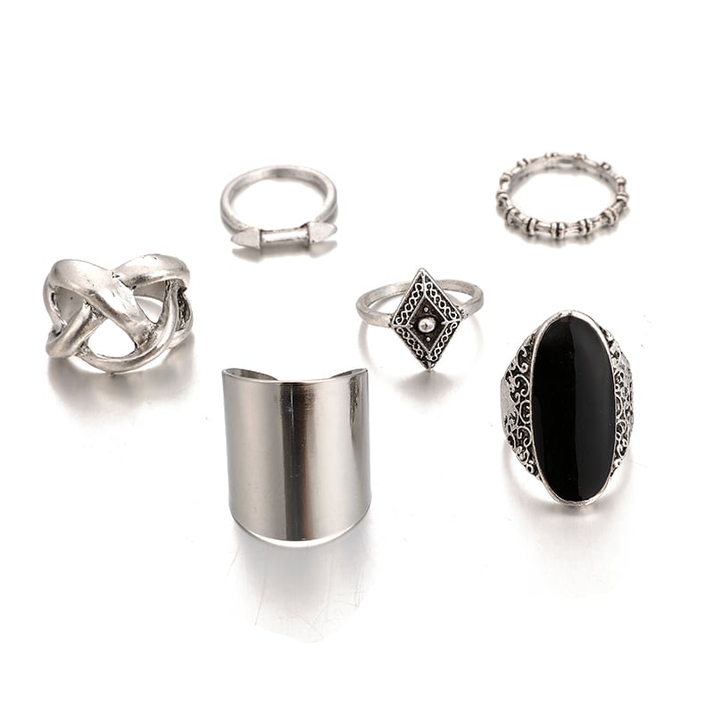 送料無料 6個/セットボヘミアレトロシルバーカラーフィンガーリングクロスアローブラックオーバルチャームリングレディースパーティージュエリー2021 指輪 銀 アクセサリー AE1777772160240779