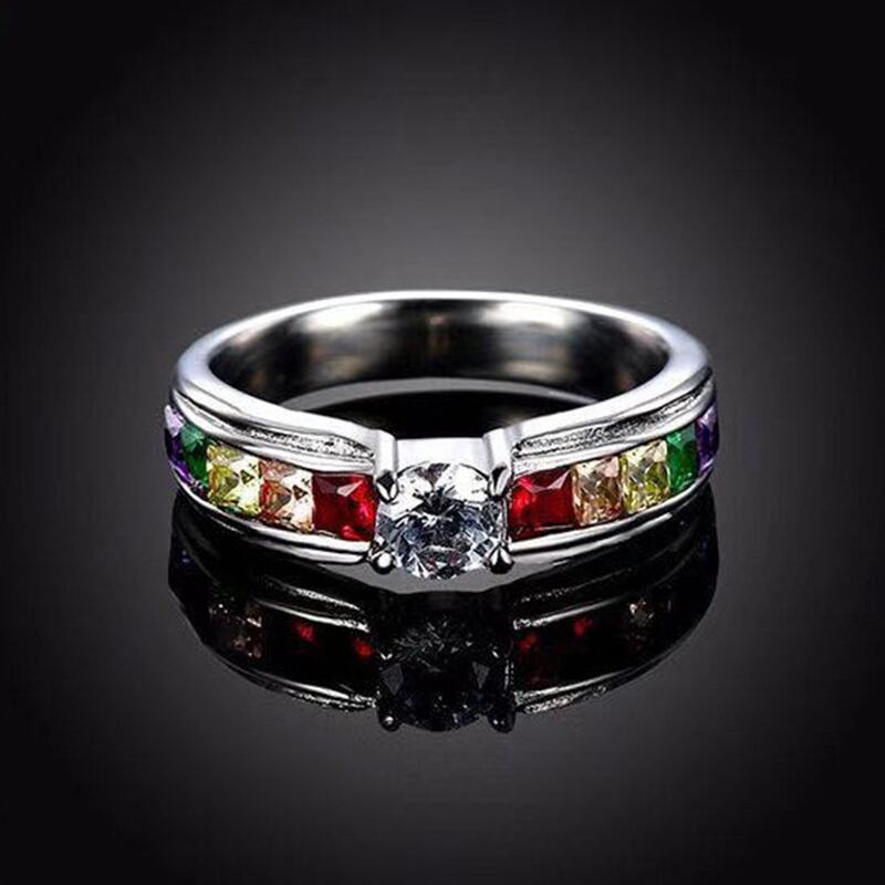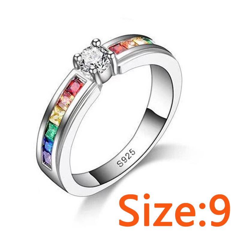 送料無料 カラフルなレインボーCZジルコンストーンシルバーメッキリング女性の女の子の婚約結婚式LGBTリングチャームパーティージュエリー 指輪 銀 アクセサリー AE1777739064974075