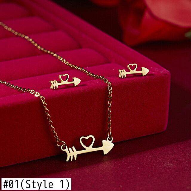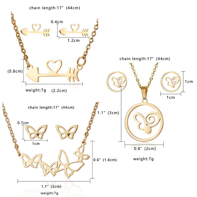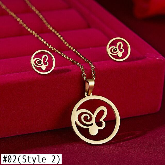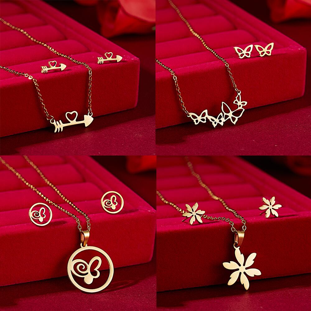 送料無料 絶妙な蝶の花の形のペンダントネックレスステンレス鋼のジュエリーセット鎖骨チェーンネックレス耳セット女性 レース リング 指輪 フラワーデザイン アクセサリー AE1777750582164104