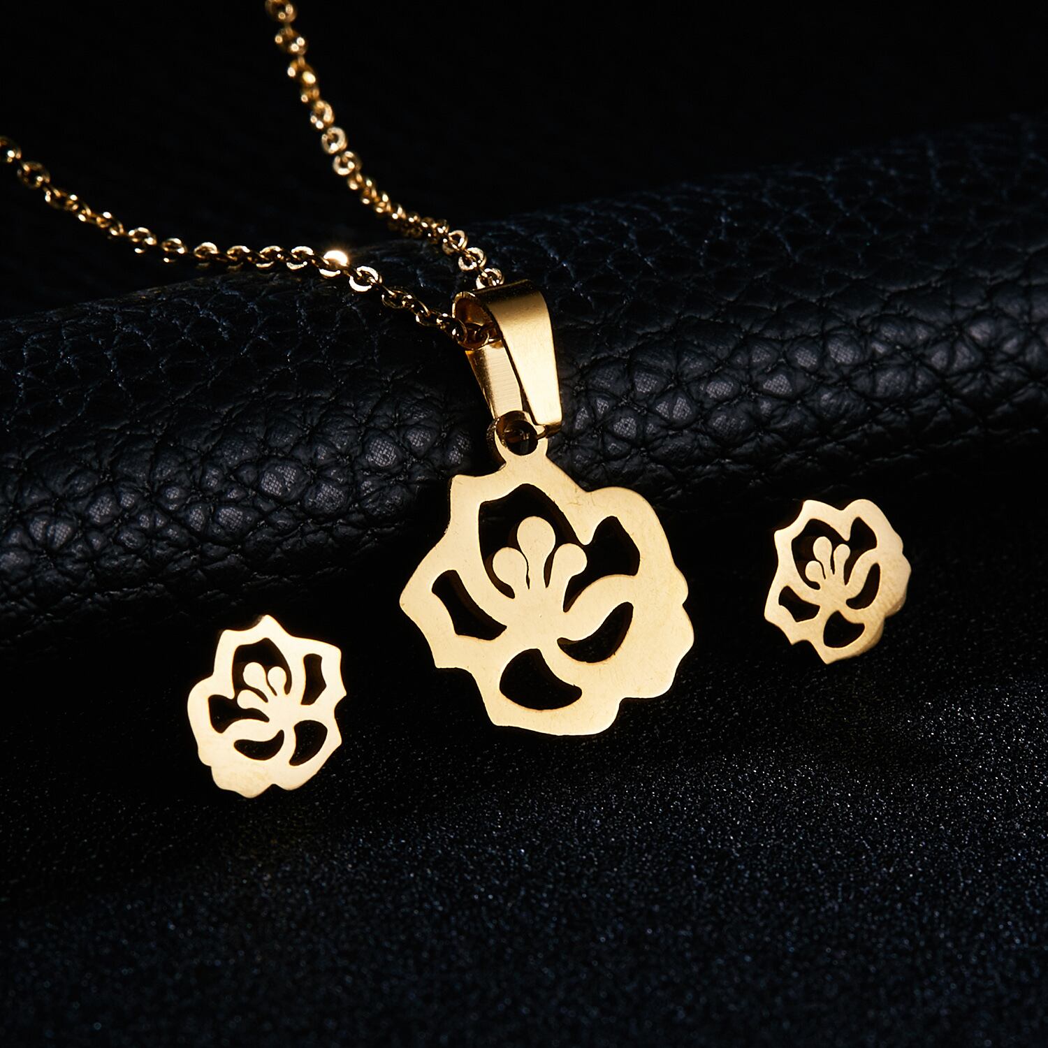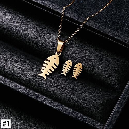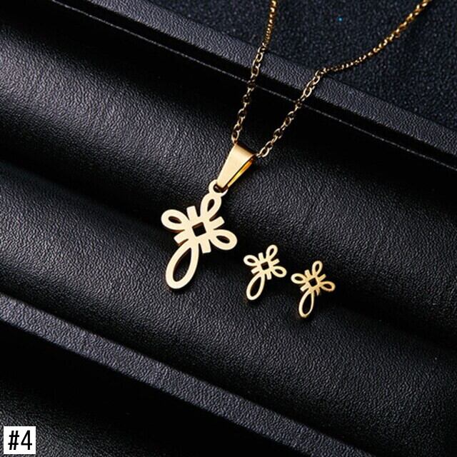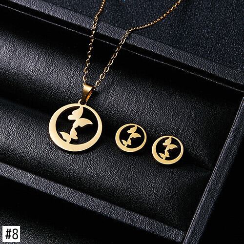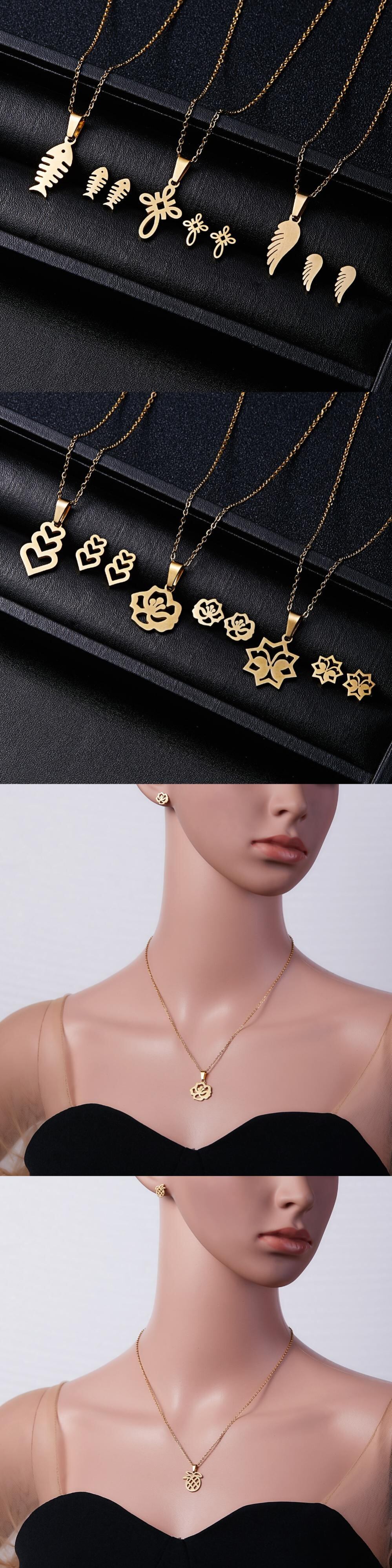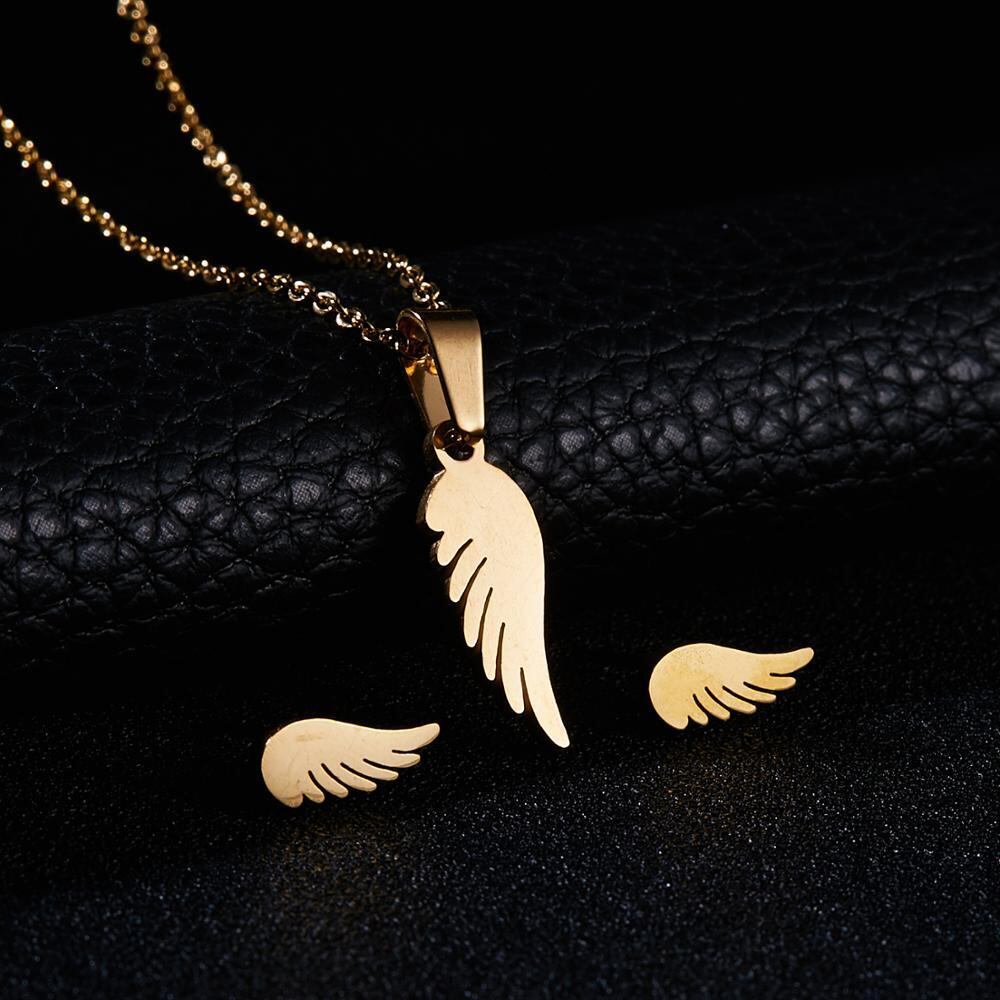 送料無料 ゴールドカラーステンレススチールジュエリーセットフィッシュホースウィングローズフラワーペンダントネックレスイヤリングセット女性のウェディングジュエリー レース 指輪 フラワーデザイン アクセサリー AE1777753655427026