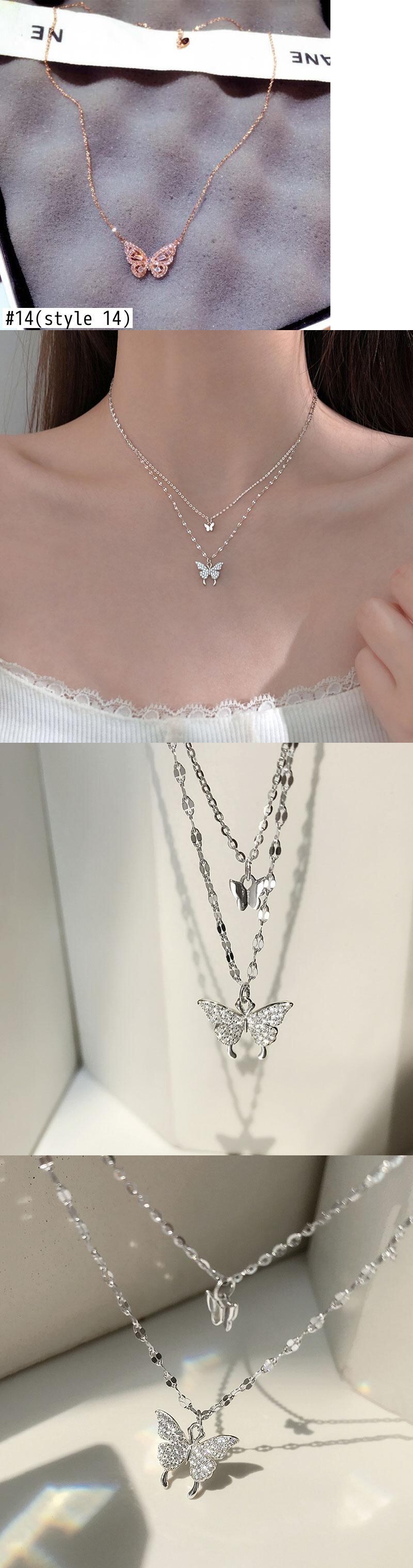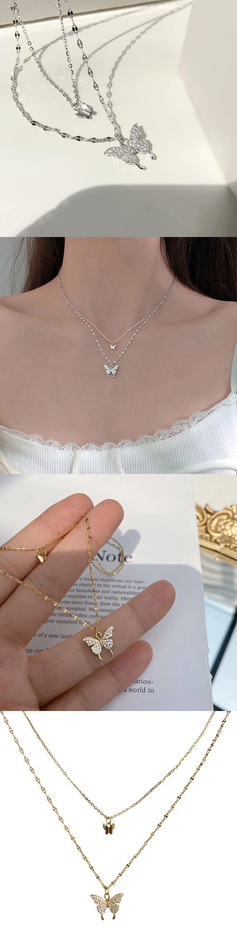 送料無料 シルバーメッキシャイニーバタフライネックレス女性絶妙なダブルレイヤー鎖骨チェーンネックレスジュエリーギフト レース 銀 アクセサリー AE1777740244311647