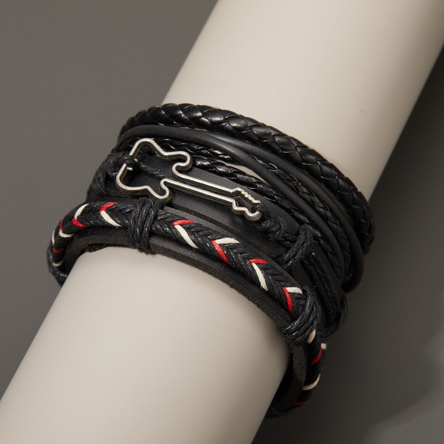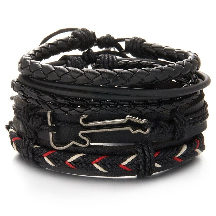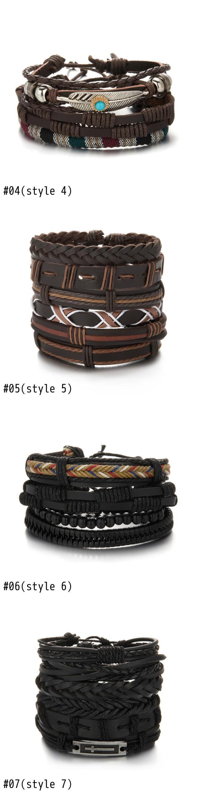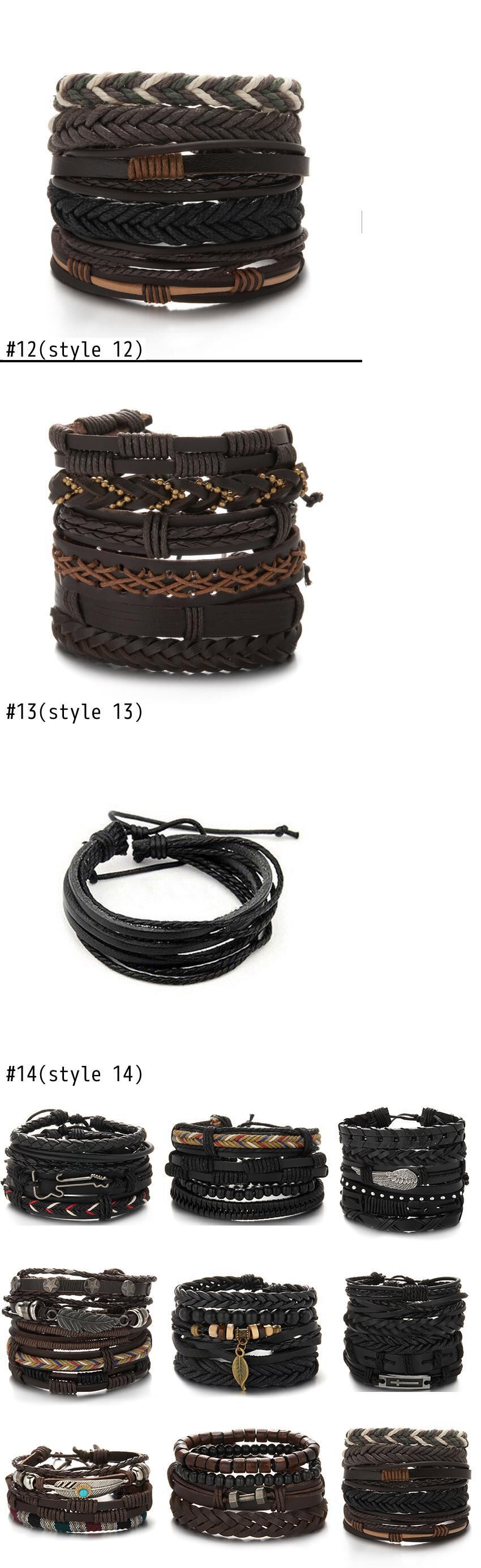 送料無料 3/4/6個/セットブラック編組ラップレザーブレスレットメンズヴィンテージマルチレイヤースターリーフチャームウッドビーズエスニックトライバルリストバンド ビンテージ アクセサリー AE1777768337907478