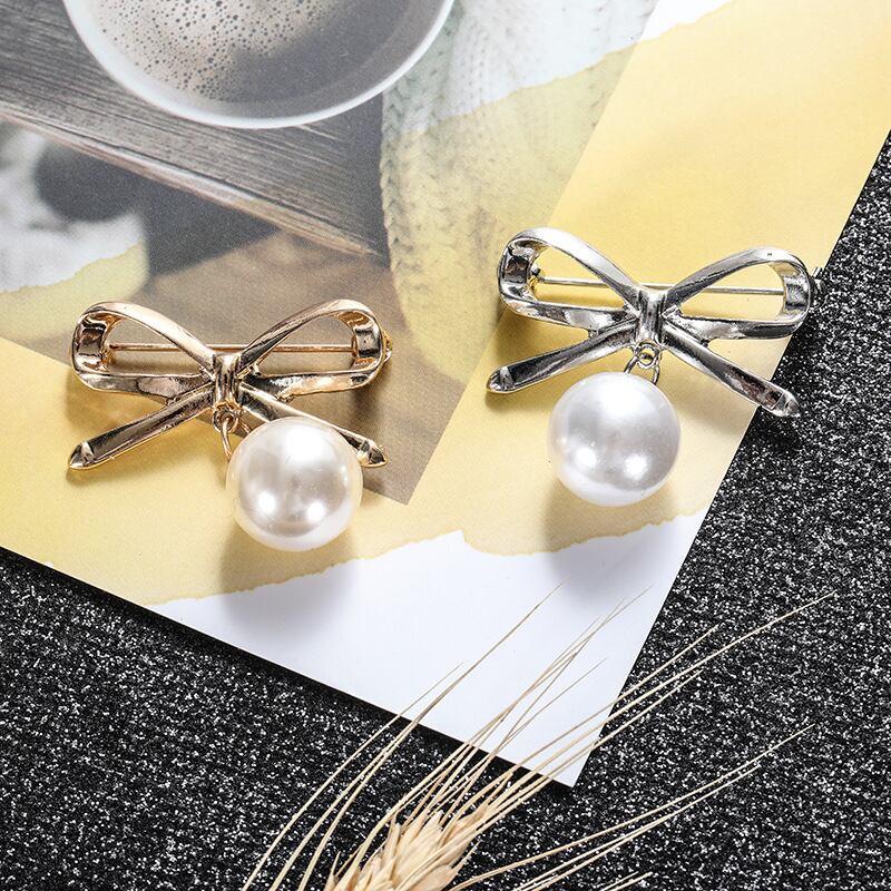 送料無料 ホット2019シルバーカラーパールビーズブローチ女性カーディガンスカーフボウ固定耐摩耗バックルエナメルピンジュエリー リボン 真珠 銀 アクセサリー AE1777759816510549