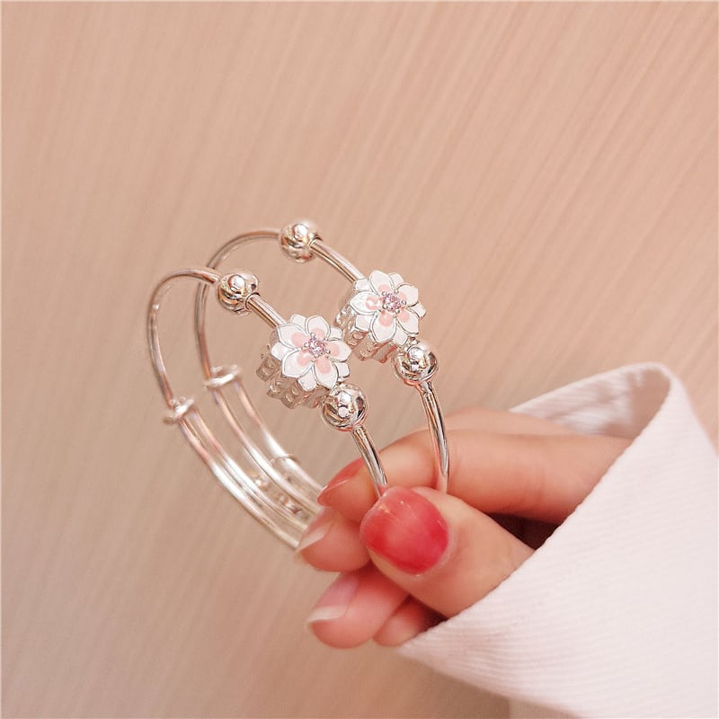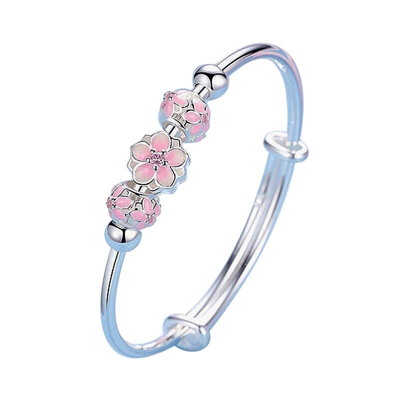 送料無料 スタイルシルバーカラーチェリーブロッサムフラワーラウンドビーズチャームブレスレットバングルレディースガールジュエリーアジャスタブル フラワーデザイン 銀 アクセサリー AE1777721916953685