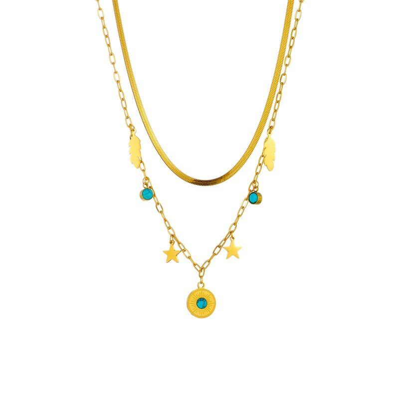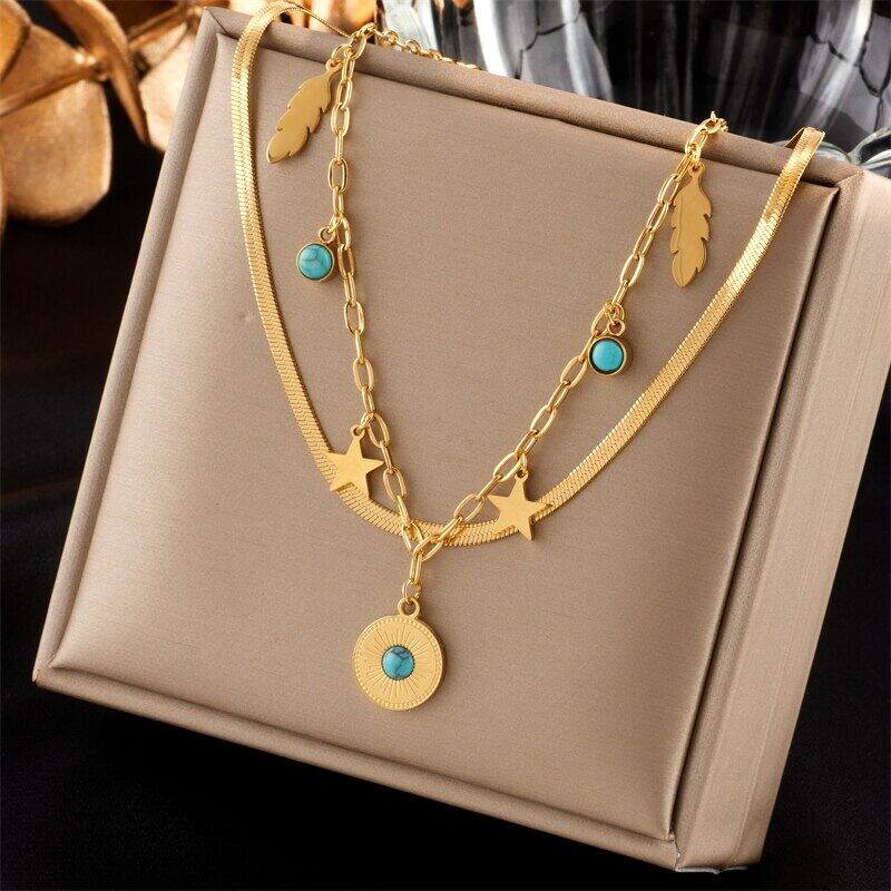 送料無料 Lステンレススチールゴールドカラーダブルレイヤーグリーンストーンスターフェザーネックレス女性チョーカーパーティーギフトジュエリー レース アクセサリー AE00111273537482