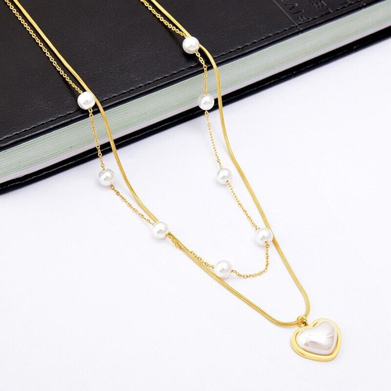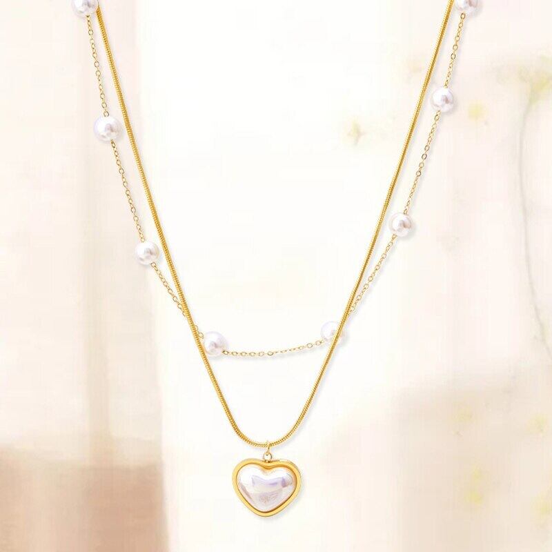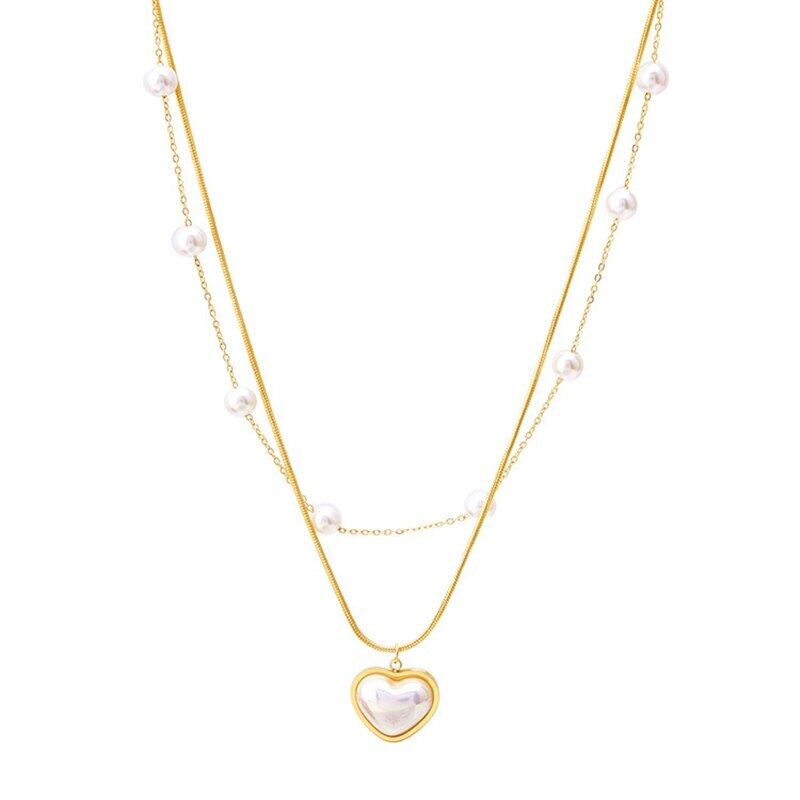 送料無料 MEYRROYUステンレススチールロマンティック2レイヤーパールハートペンダントネックレスレディースガールギフトトレンドチェーンジュエリーパーティー レース 真珠 アクセサリー AE001192371777316
