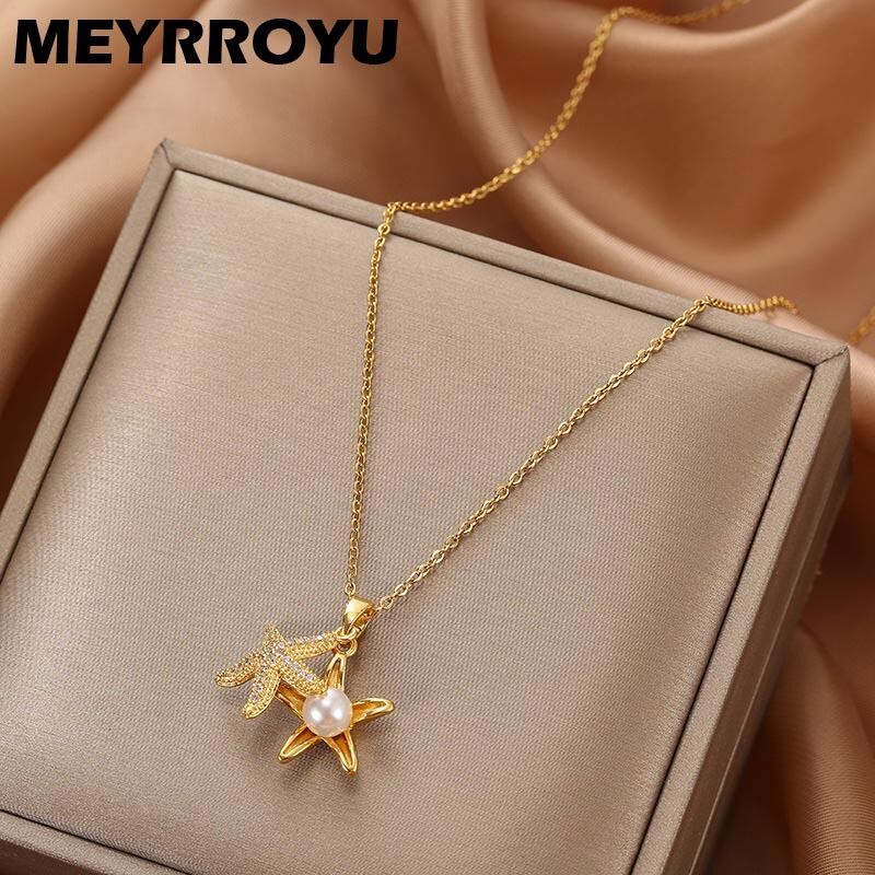 送料無料 MEYRROYUステンレススチールスターフィッシュパールネックレスレディースラグジュアリーオープンペンダントゴールドネックレスジュエリー2021トレンド レース 真珠 アクセサリー AE00117501934534