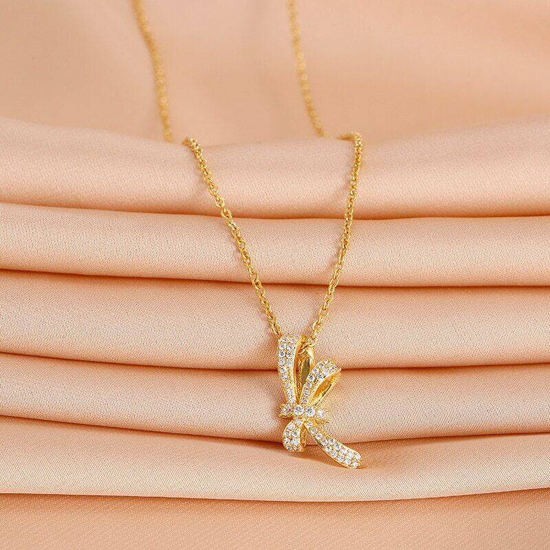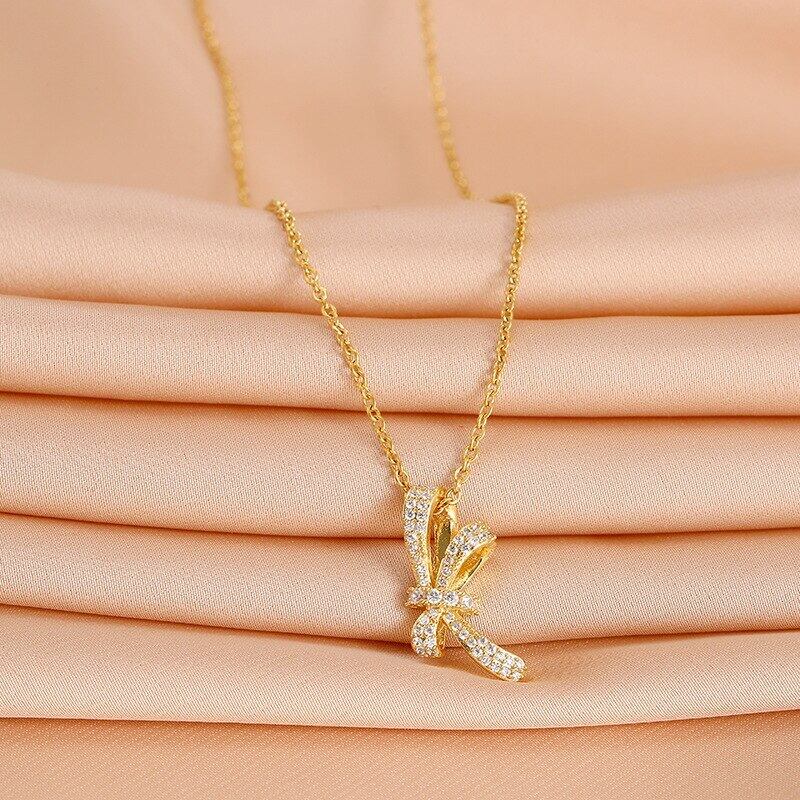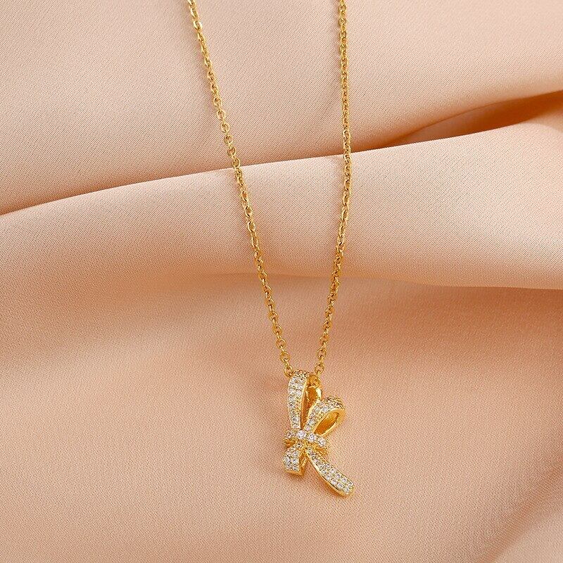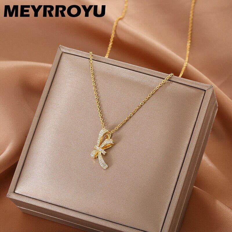 送料無料 MEYRROYUステンレススチールジルコンボウノットペンダントネックレスレディースゴールドカラー鎖骨ネックチェーンジュエリー2021トレンド リボン レース アクセサリー AE001142916410421