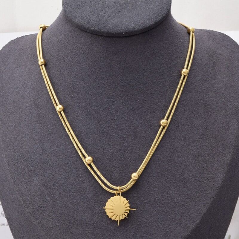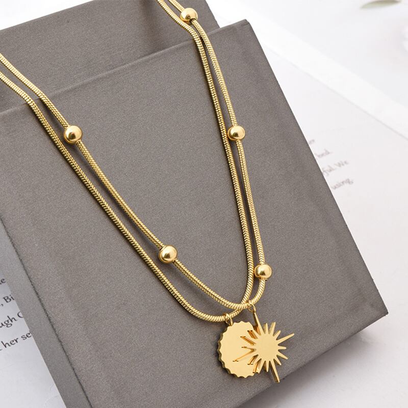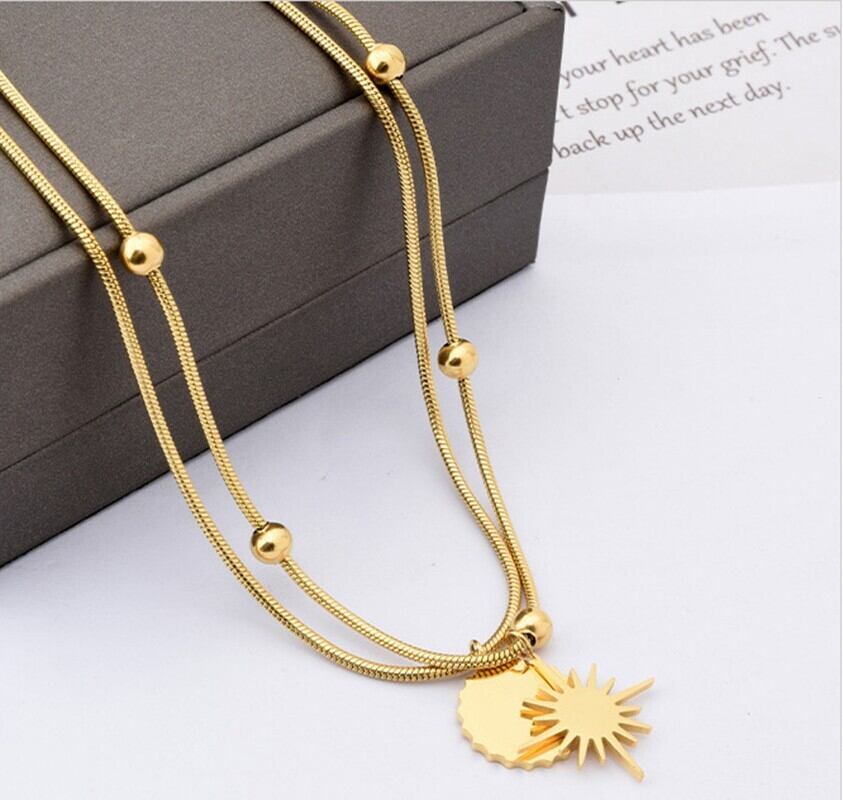 送料無料 MEYRROYUステンレススチールゴールドカラースターサンパンデントネックレス女性ダブルレイヤーチョーカー2021トレンディなギフトジュエリー レース アクセサリー AE001156638764706