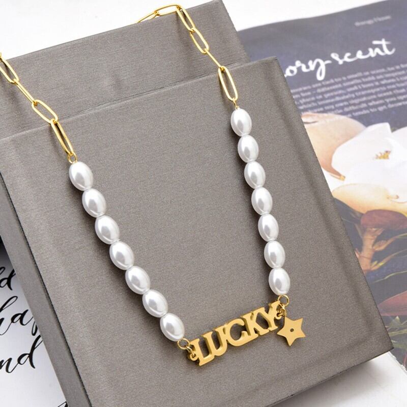 送料無料 MEYRROYUステンレススチールゴールドカラーパールスターレターラックペンダントネックレスレディースチョーカー2021トレンディなギフトジュエリー レース 真珠 アクセサリー AE001121633000909