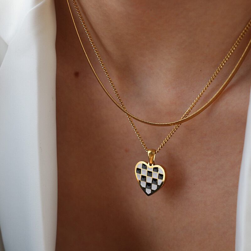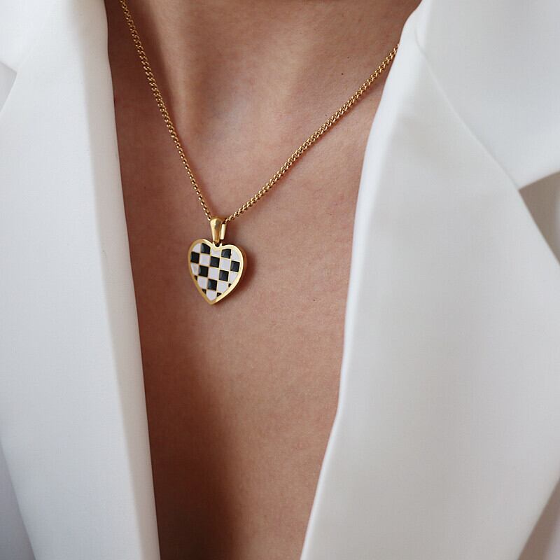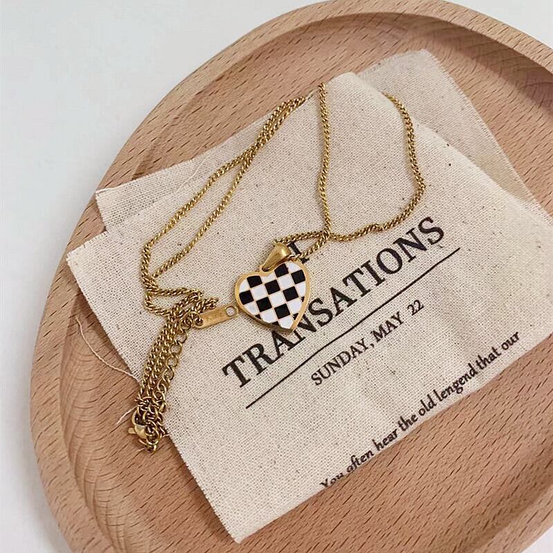 送料無料 MEYRROYUステンレス鋼ロマンチックな黒と白のグリッドハートネックレス女性チェーン2021トレンドパーティーギフトジュエリー ホワイト ブラック レース アクセサリー AE001126641336344