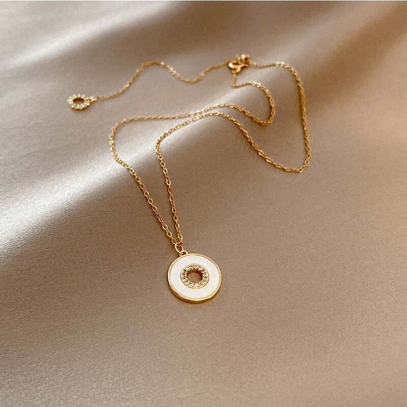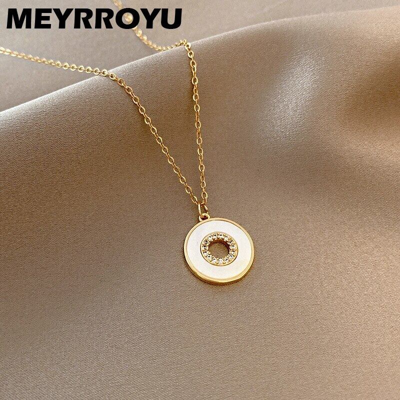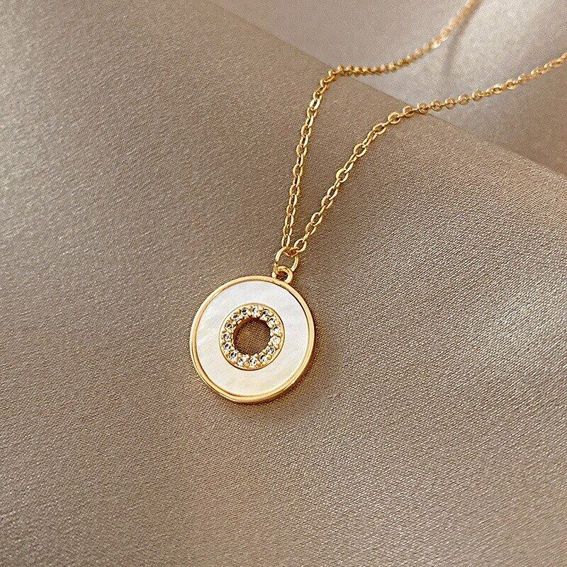 送料無料 シンプルシェルラウンドペンダントステンレススチールネックレス女性パーソナリティジルコンネックチェーンジュエリーアクセサリー レース アクセサリー AE001146679080694