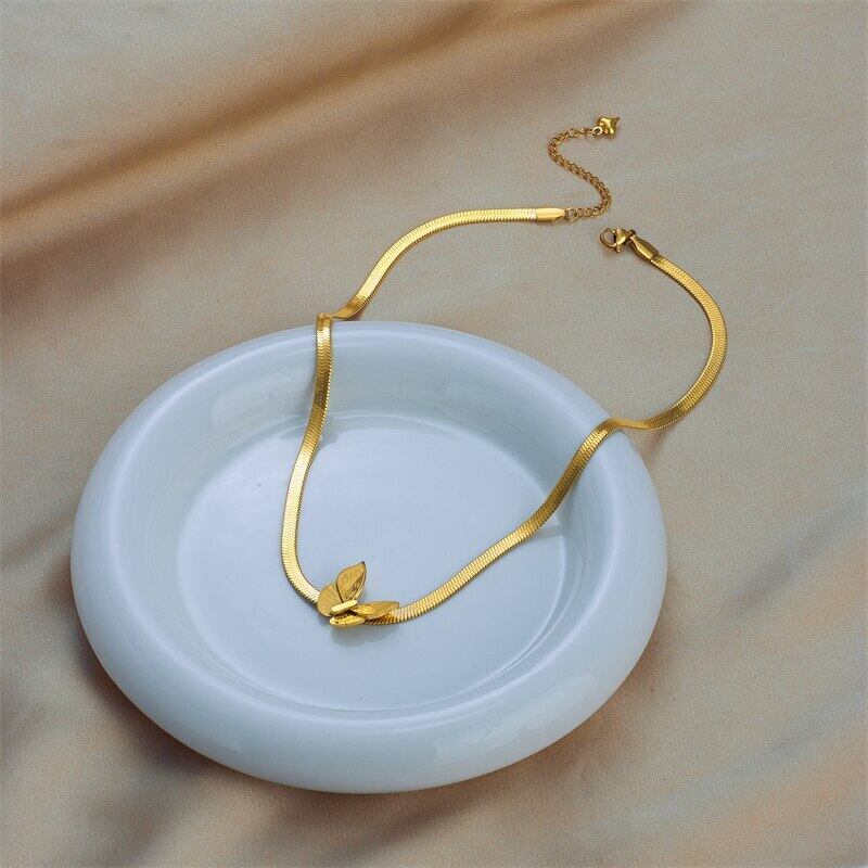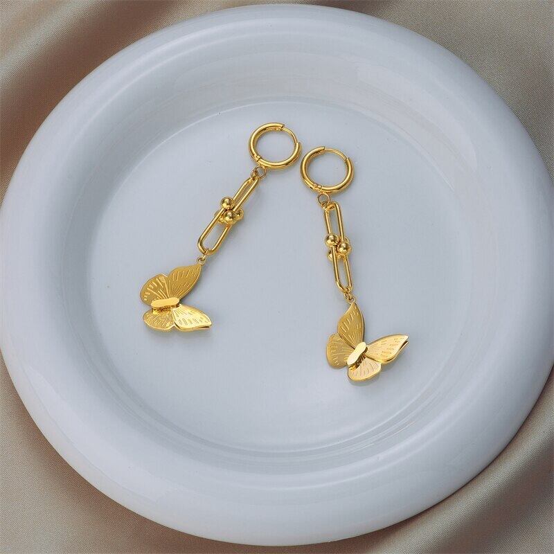 送料無料 ステンレススチールゴールドカラーバタフライスネークチェーンジュエリーセット女性用ネックレスとイヤリングパーティーギフト レース 指輪 アクセサリー AE001126048230258