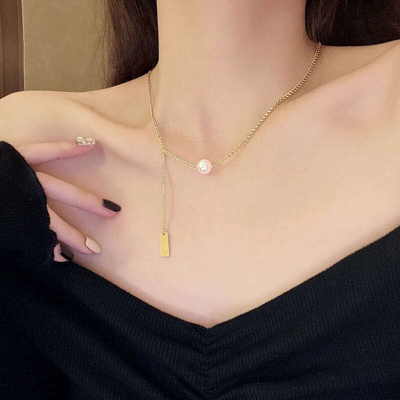 送料無料 MEYRROYUステンレススチールトレンドパールネックレスレディーススクエアタグロングテルペンダントネックチェーンジュエリーアクセサリー レース 真珠 スクウェア アクセサリー AE001163498465189