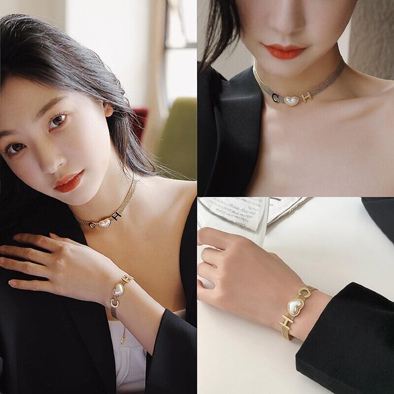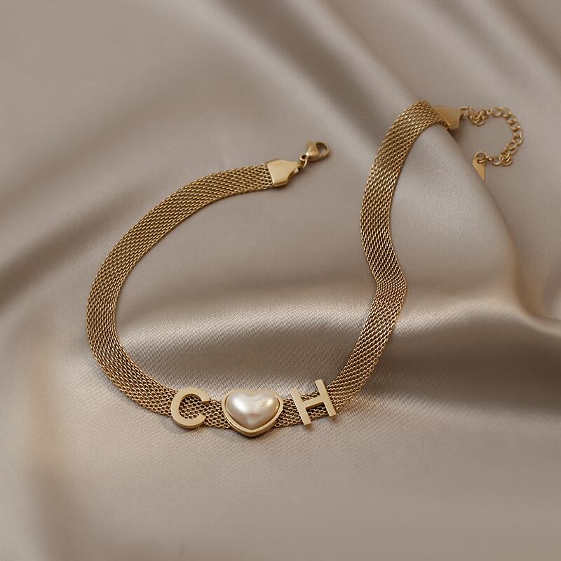 送料無料 MEYRROYUステンレススチールゴールドカラーレターCHパールハートネックレスブレスレット女性2021トレンドパーティーギフトジュエリー レース 真珠 アクセサリー AE001150575746611
