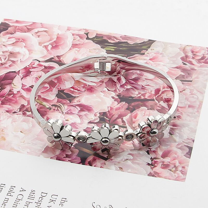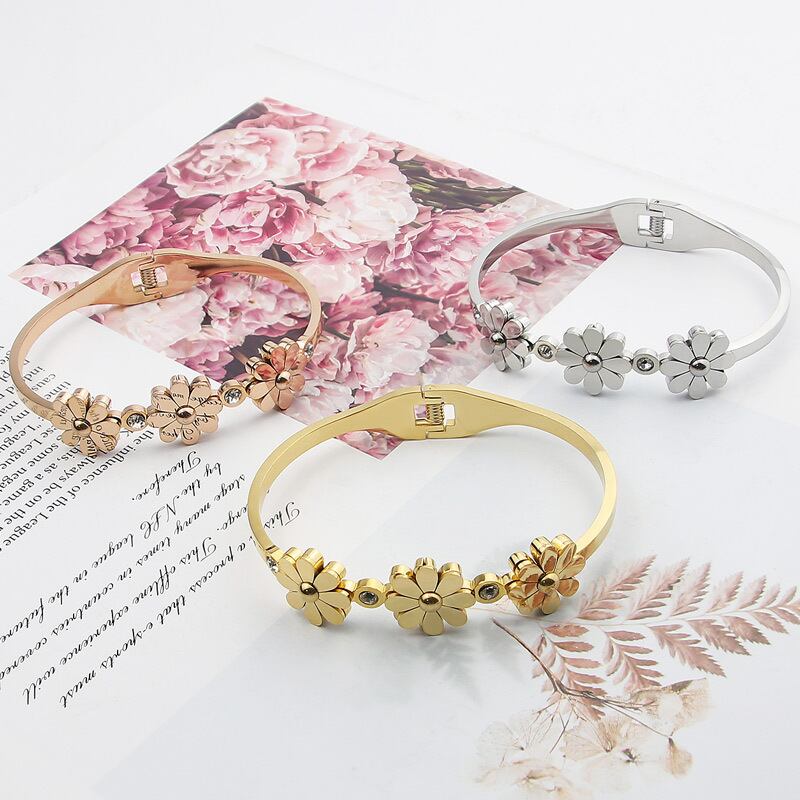 送料無料 かわいいクリスタルと3つの菊の形のブレスレット&バングルステンレス鋼スプリングオープンゴールドカラーバングル女性のジュエリー 大人ガーリー スウィート キュート カジュアル 春物 アクセサリー AE00887795908734379