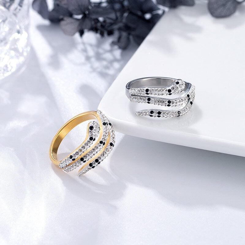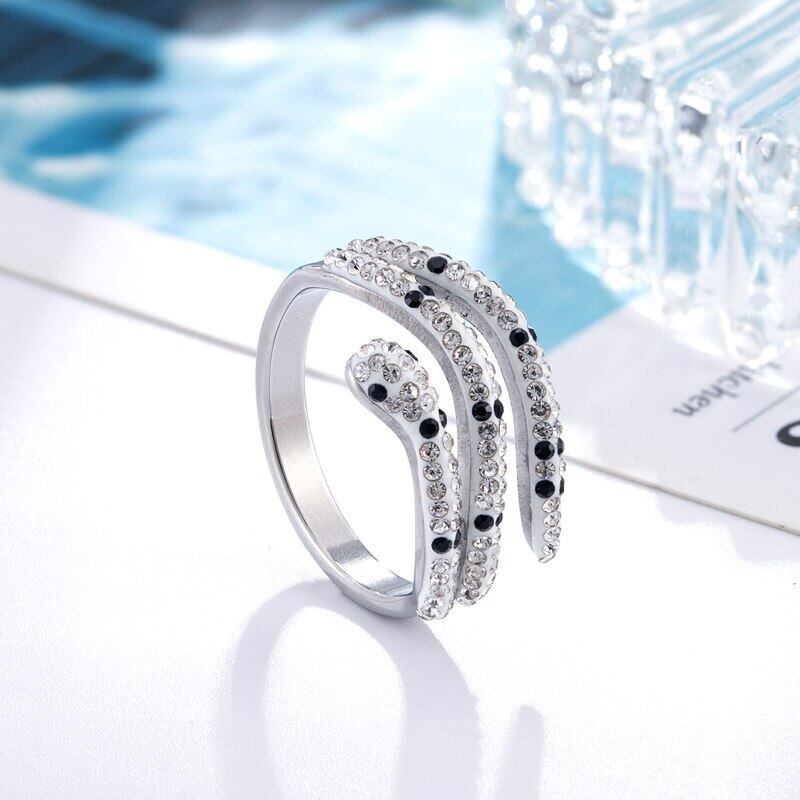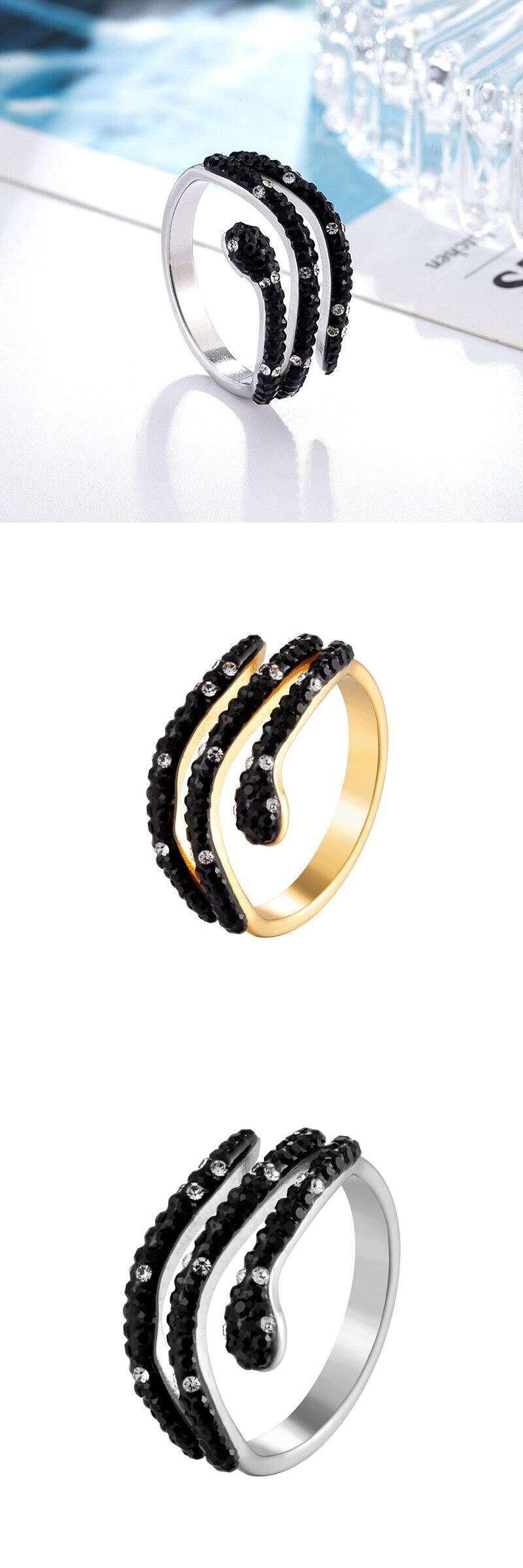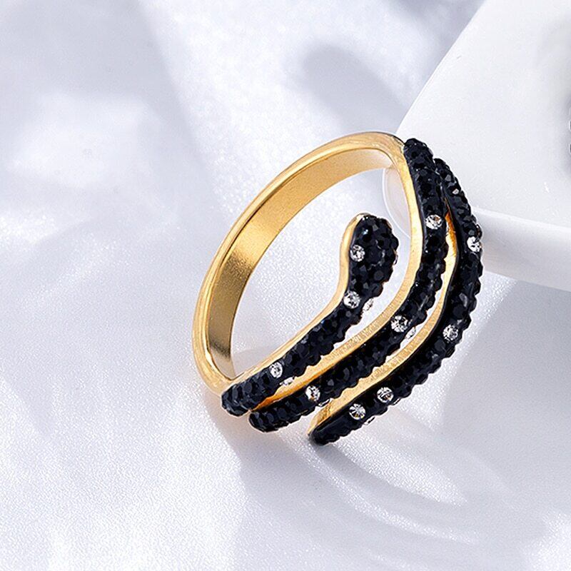 送料無料 黒と白のクリスタルスネークステンレススチールリング女性ギフトゴールドカラージュエリーリング ホワイト ブラック 指輪 アクセサリー AE00887750835277160
