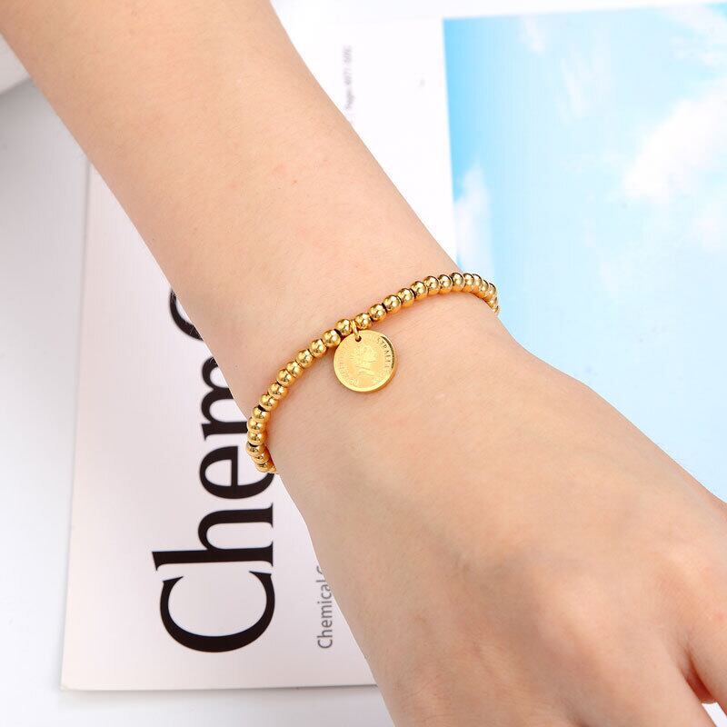送料無料 弾性ロープビーズブレスレットラウンドクイーンヘッドブレスレット女性ステンレス鋼レトロジュエリーギフト エラスティック 伸縮 アクセサリー AE00887718070002984