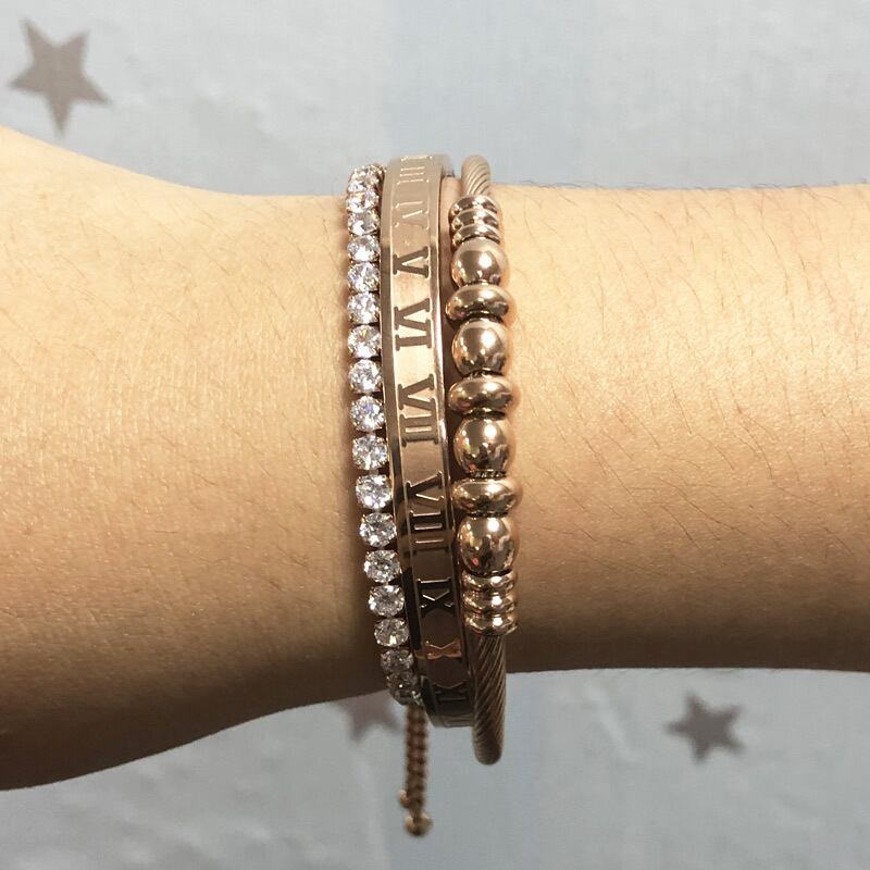 送料無料 3個/セット美しい展開ステンレス鋼手作りジルコンブレスレットローマ数字バングルビーズケーブルワイヤーバングル女性ジュエリー アクセサリー AE00887765650902519