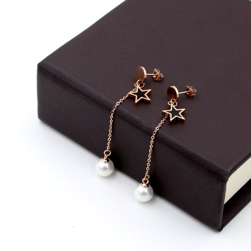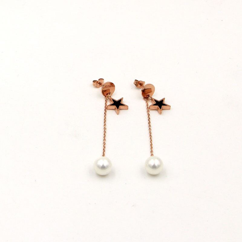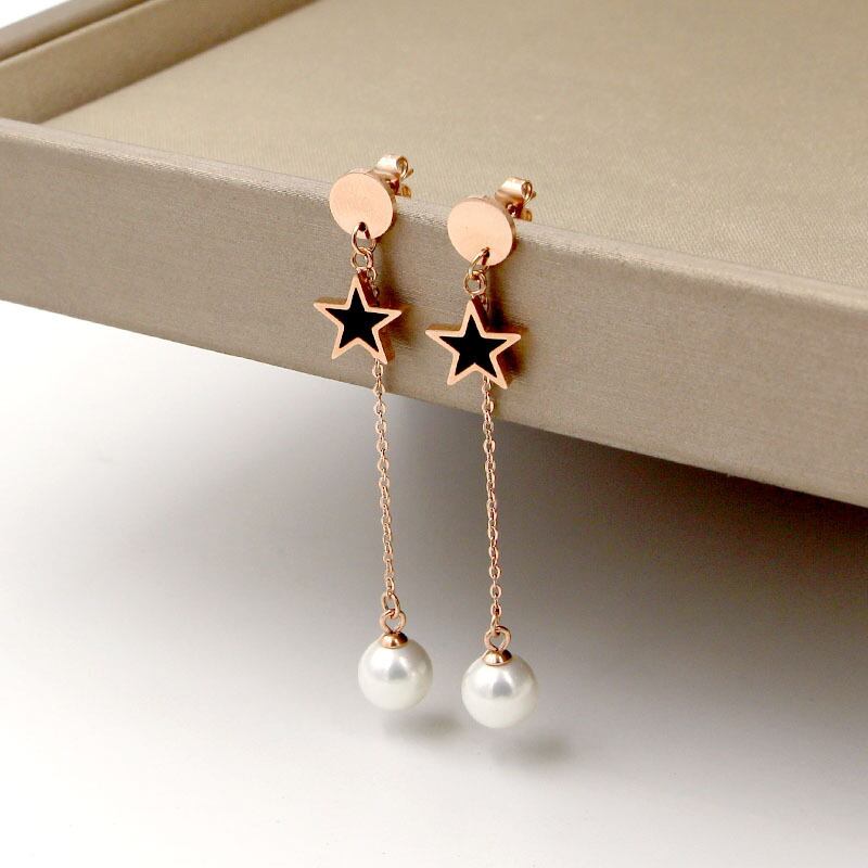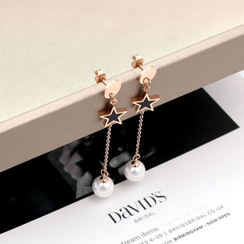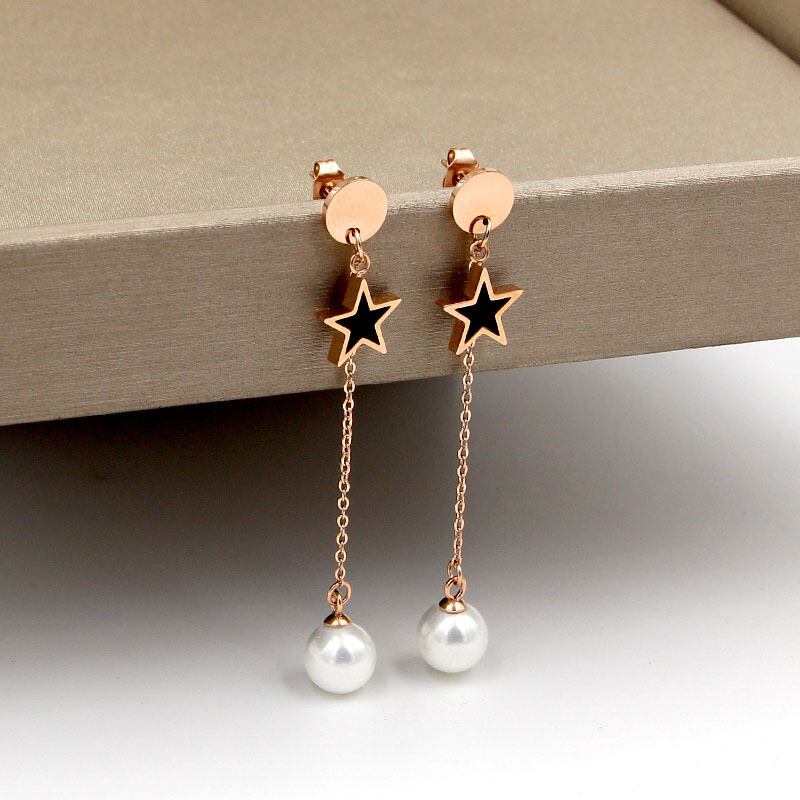 送料無料 ジュエリーブラックペンタグラムチェーンパールローズゴールドロングスタッドピアスチタンスチールスタッドピアスレディース卸売 イヤリング 真珠 リング 指輪 アクセサリー AE008877277052237
