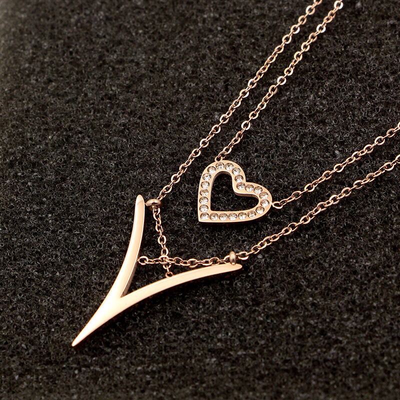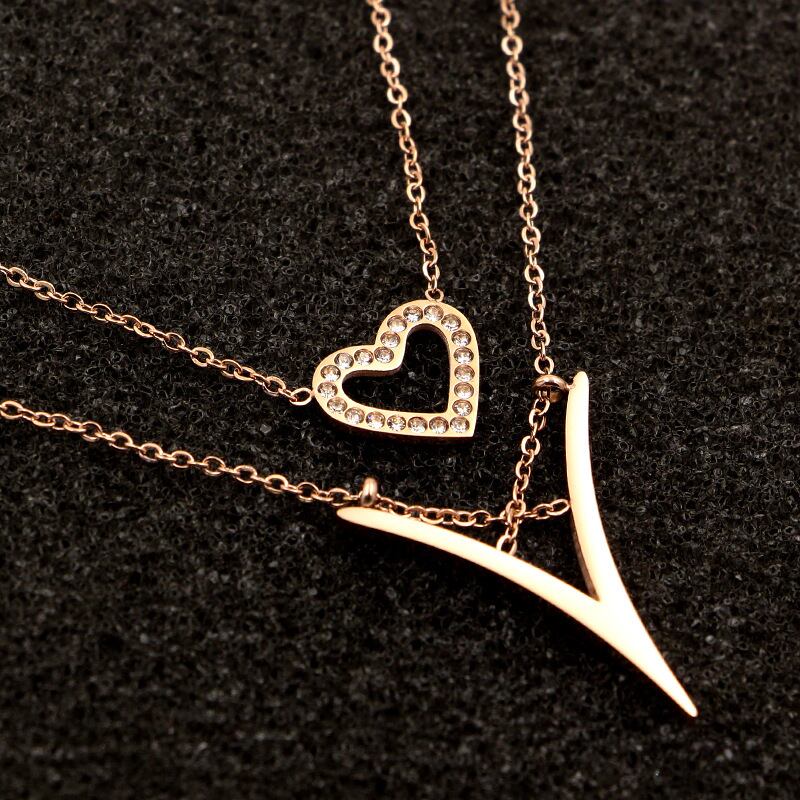 送料無料 ホットな新しいファッション二層V字型クリスタルピーチハートペンダントローズゴールド女性ネックレス女性ジュエリー卸売 レース アクセサリー AE00887739750602593