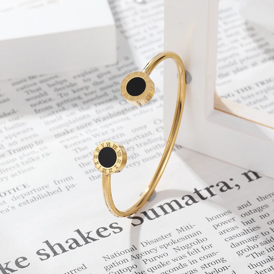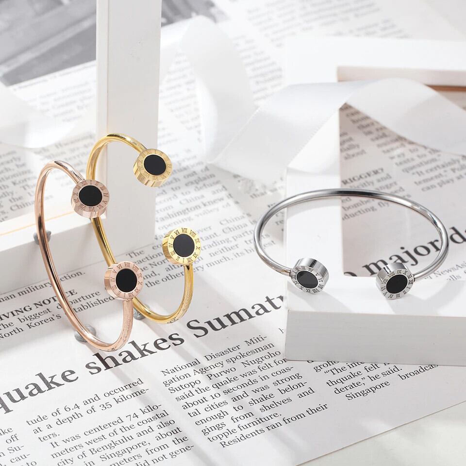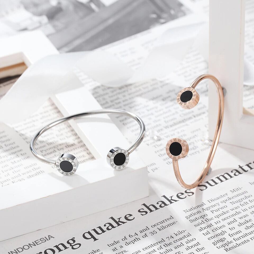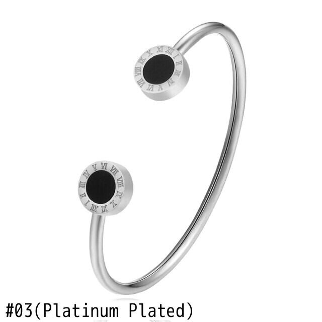 送料無料 ホットレディースジュエリー、ローマ数字ブラックエナメルステンレススチールオープンブレスレットパーティーギフトバングル アクセサリー AE00887739534788044