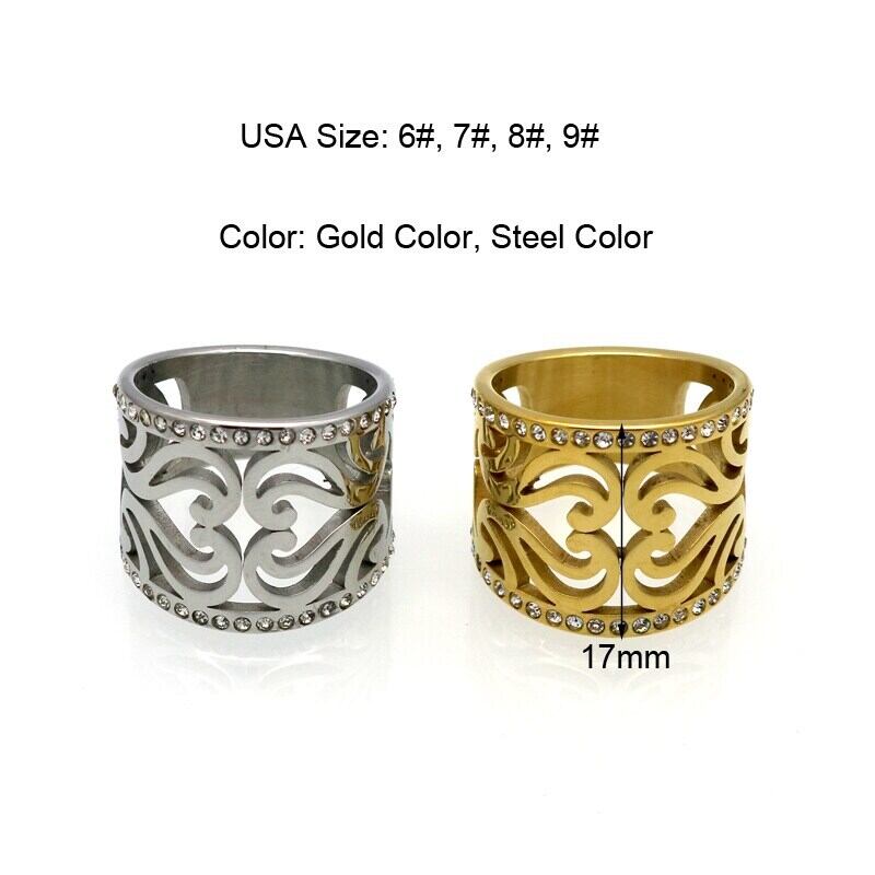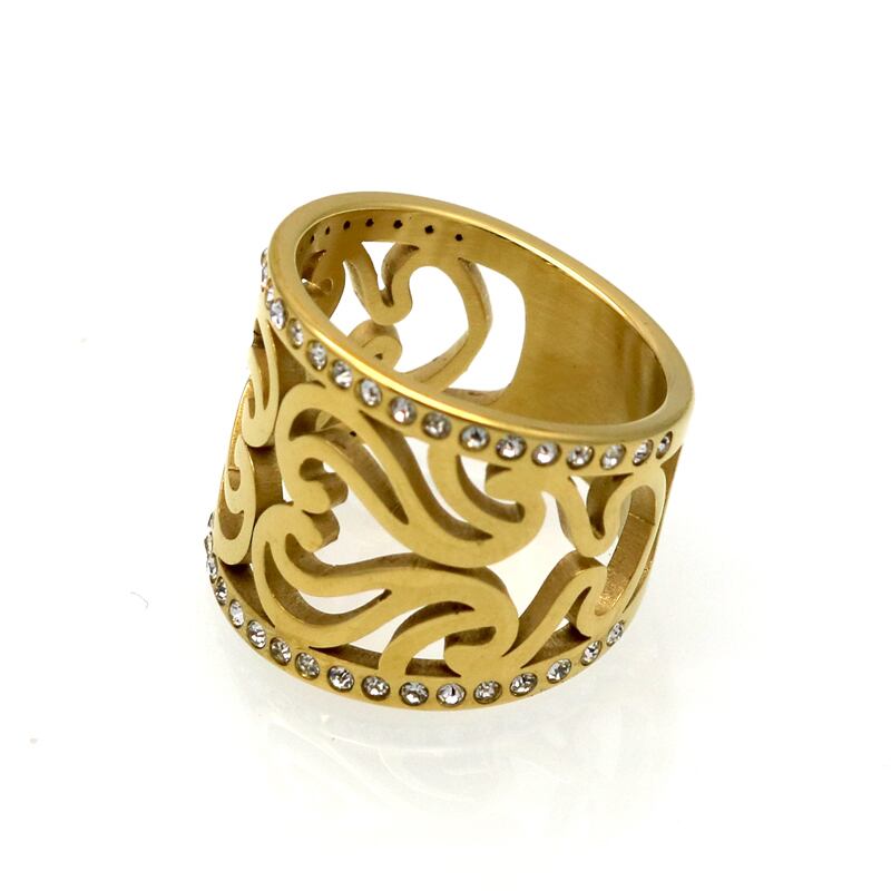 送料無料 17mm幅中空フラワーラインストーンリング316Lステンレススチールリングレディースゴールドカラーパーティージュエリー 指輪 フラワーデザイン アクセサリー AE00887711584983578