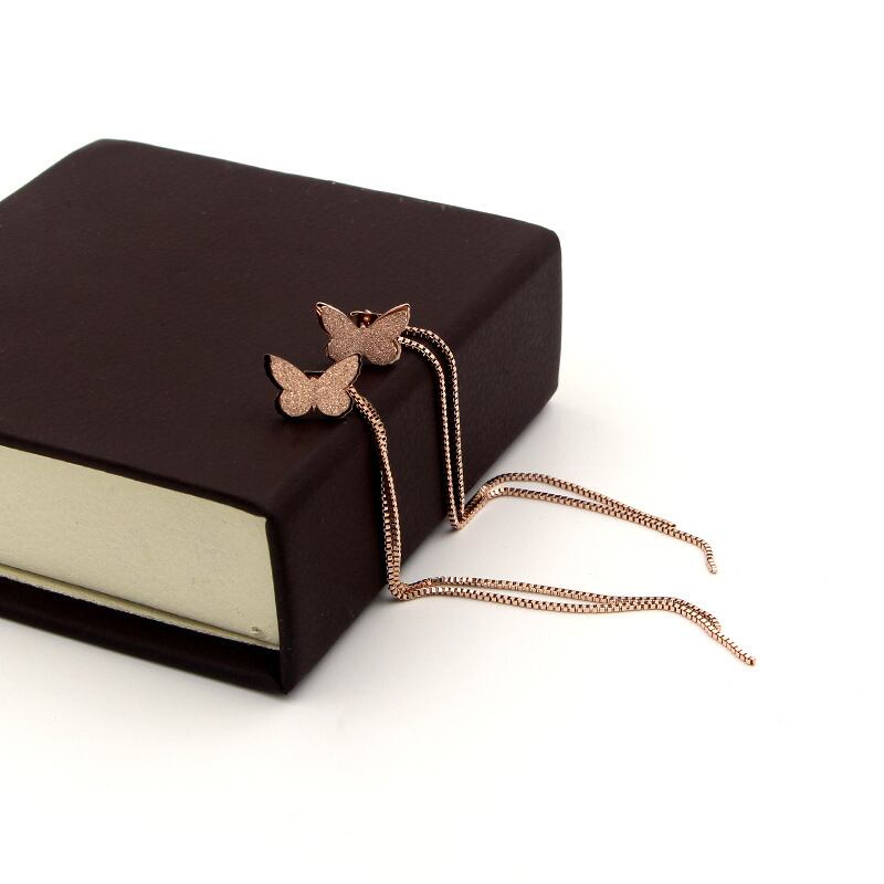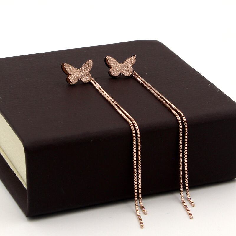 送料無料 新しい美しいローズゴールデンフロストバタフライハンギングボックスチェーンtelイヤリングワイルドチタンスチールレディースイヤリング 指輪 アクセサリー AE00887727377347127