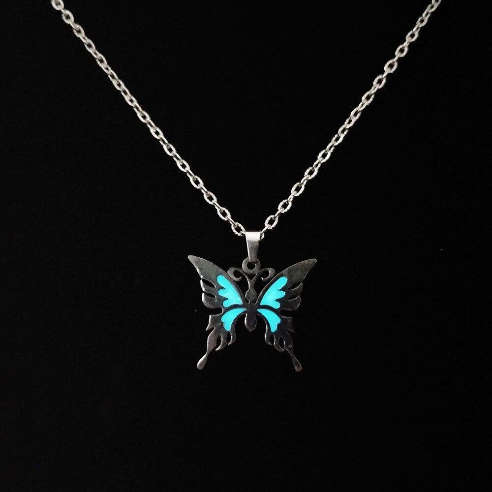 送料無料 ヴィンテージ蛍光バタフライペンダントネックレスパーソナリティは暗闇の中で輝きますステンレス鋼のネックレス女性のジュエリーチャームギフト レース ビンテージ アクセサリー AE888858029582074