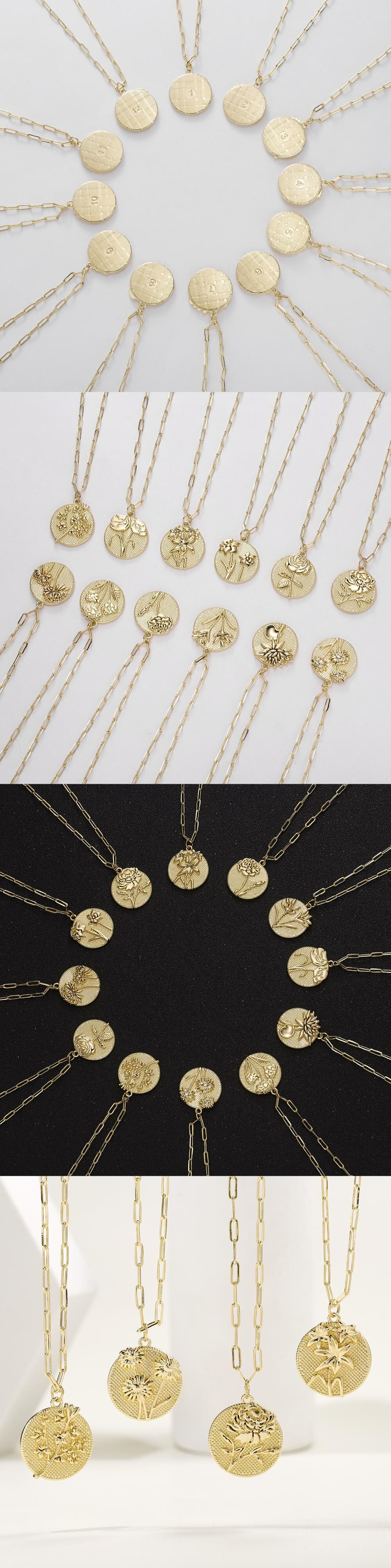 送料無料 クリエイティブ誕生月コインパターンフラワーペンダントネックレスゴールドカラーペーパークリップチェーンカーネーション植物ネックレス母の日ギフト レース フラワーデザイン アクセサリー AE888886491842431