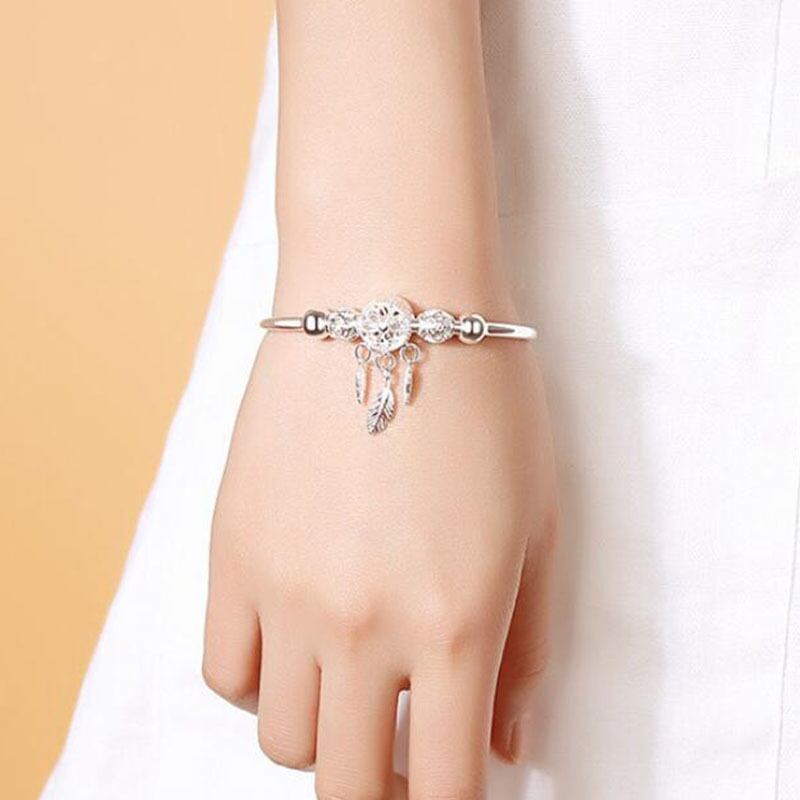 送料無料 シルバーカラードリームキャッチャーテルフェザーラウンドビーズチャームブレスレットアジャスタブルバングルレディースウェディングジュエリー 銀 アクセサリー AE888874577362717
