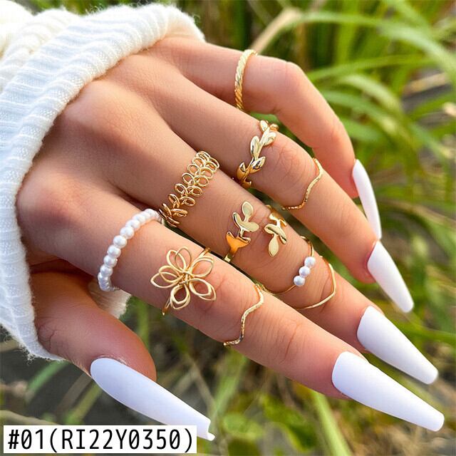 送料無料 5個/10個フェイクパールリーフフラワーデコレーションリングセットラインストーンバタフライディテールリングレディースメタルナックルフィンガーリングジュエリー ファー 指輪 真珠 フラワーデザイン アクセサリー AE888852906572962