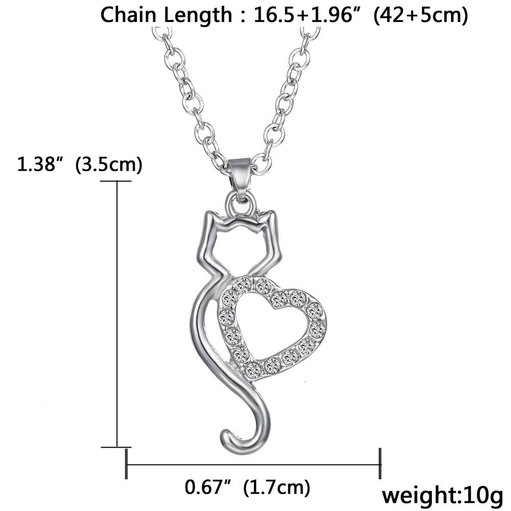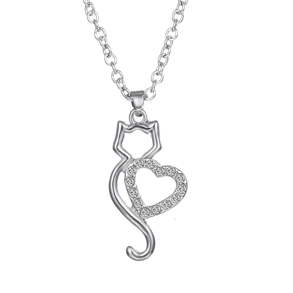 送料無料 シルバーカラークリスタルキャットネックレス女性ウェディングペンダントチェーンジュエリーギフトキャットハートネックレスアニマルペット レース 銀 アクセサリー AE888898923667945
