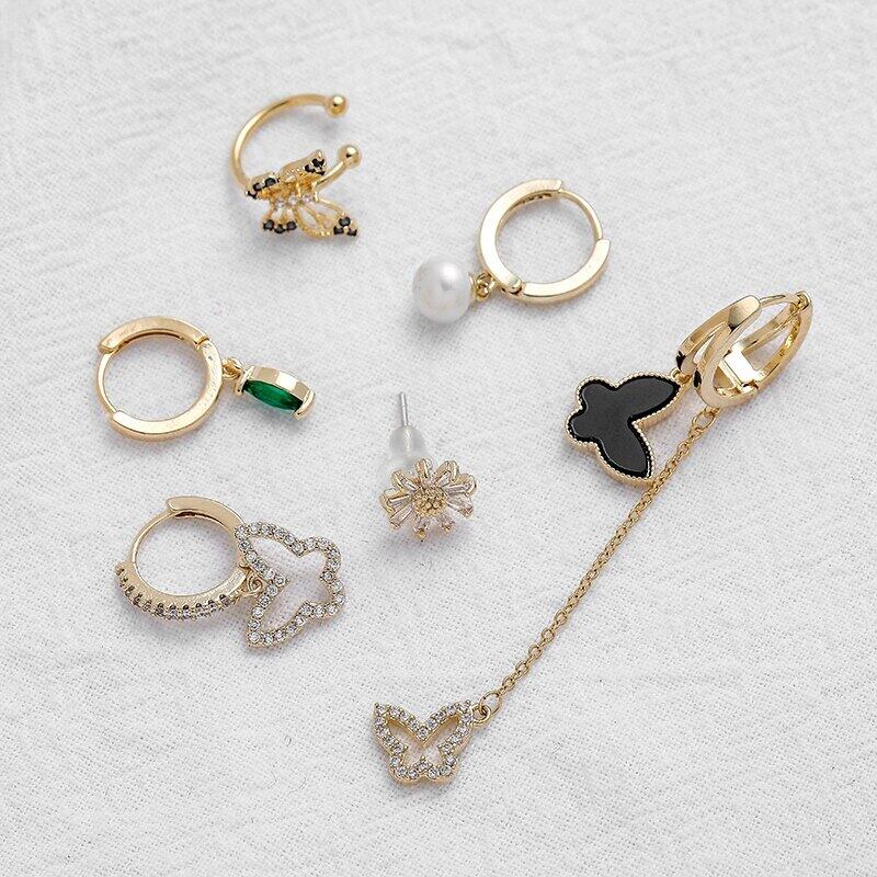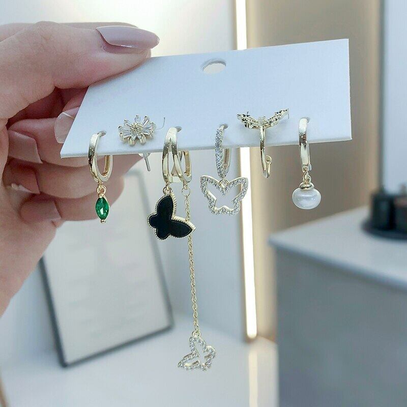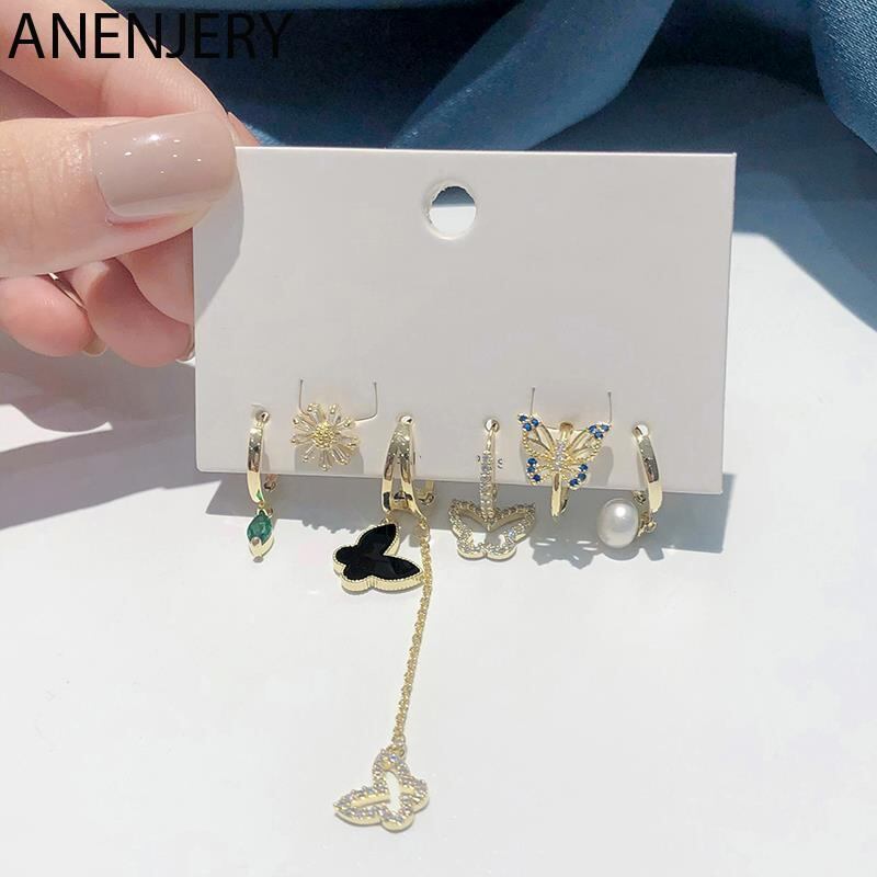送料無料 ANENJERYシルバーカラー銅ジルコンバタフライTelイヤリングクリップイヤリング女性の魅力的な6ピースイヤリングセットジュエリー 指輪 銀 アクセサリー AE165598222084890