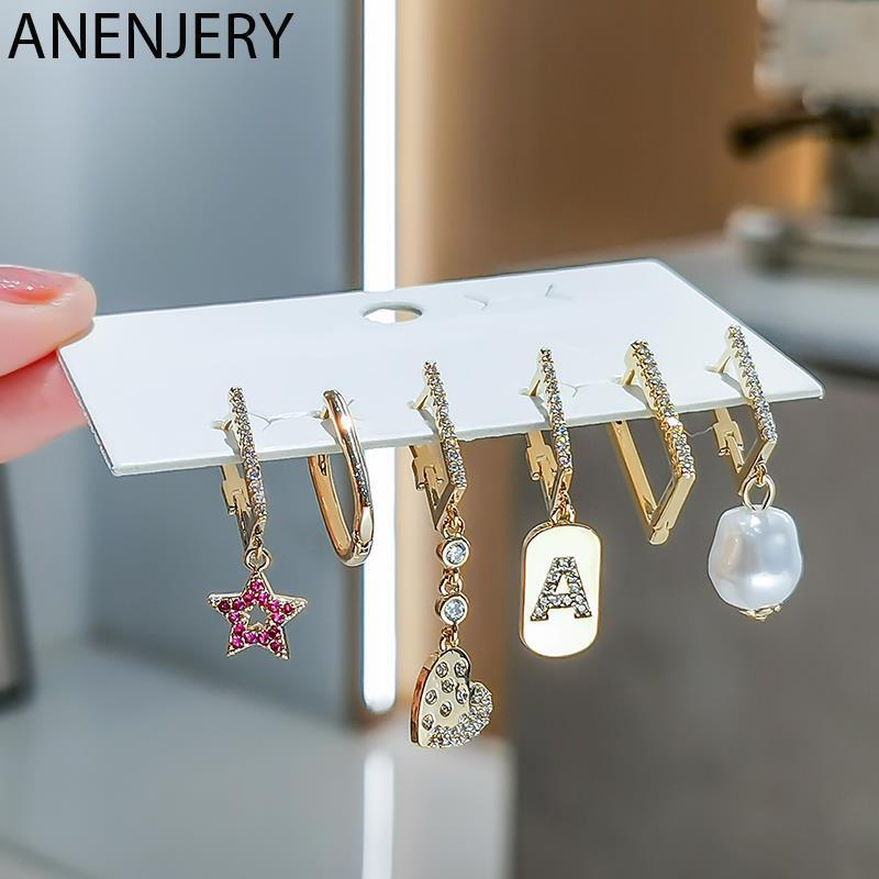 送料無料 ANENJERY6個/セットシルバーカラーカッパースターハートフープピアスセットクリエイティブマイクロジルコン幾何学ピアス イヤリング リング 指輪 銀 アクセサリー AE165552359575625