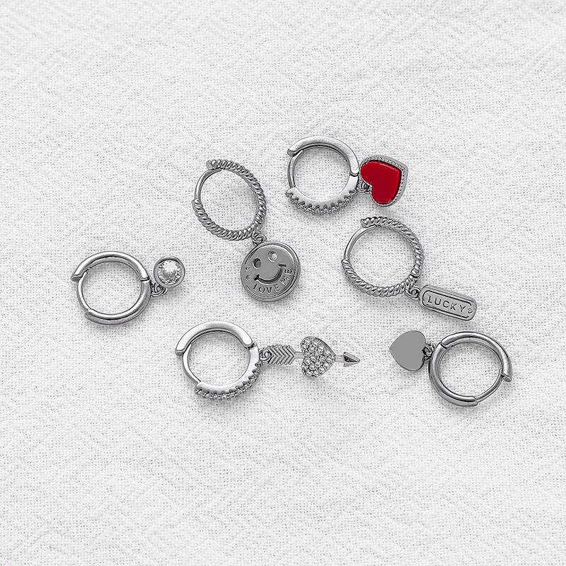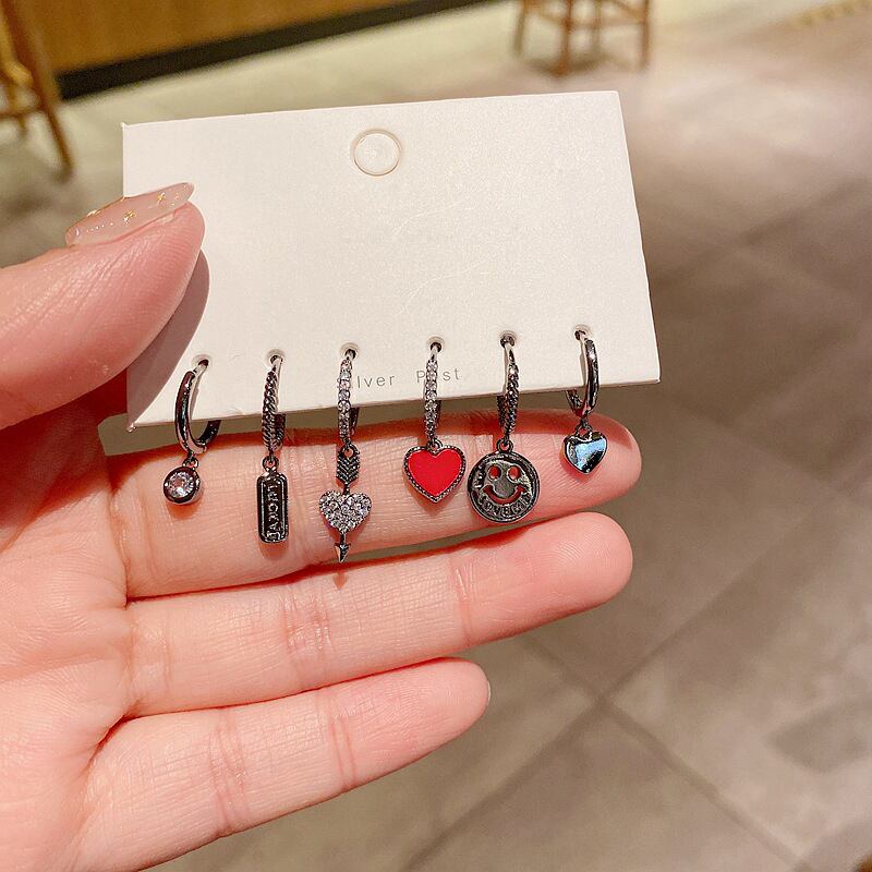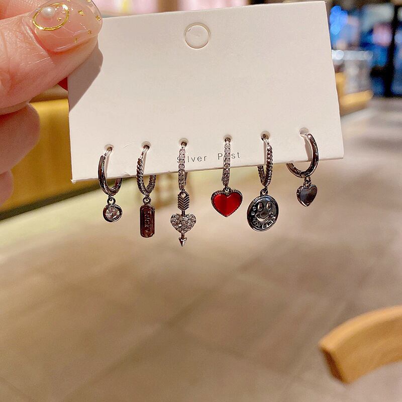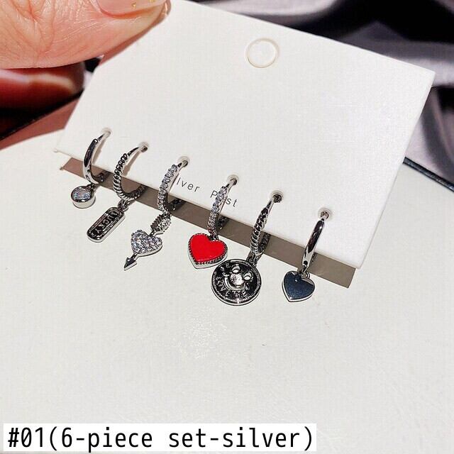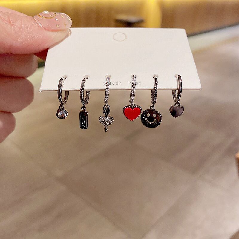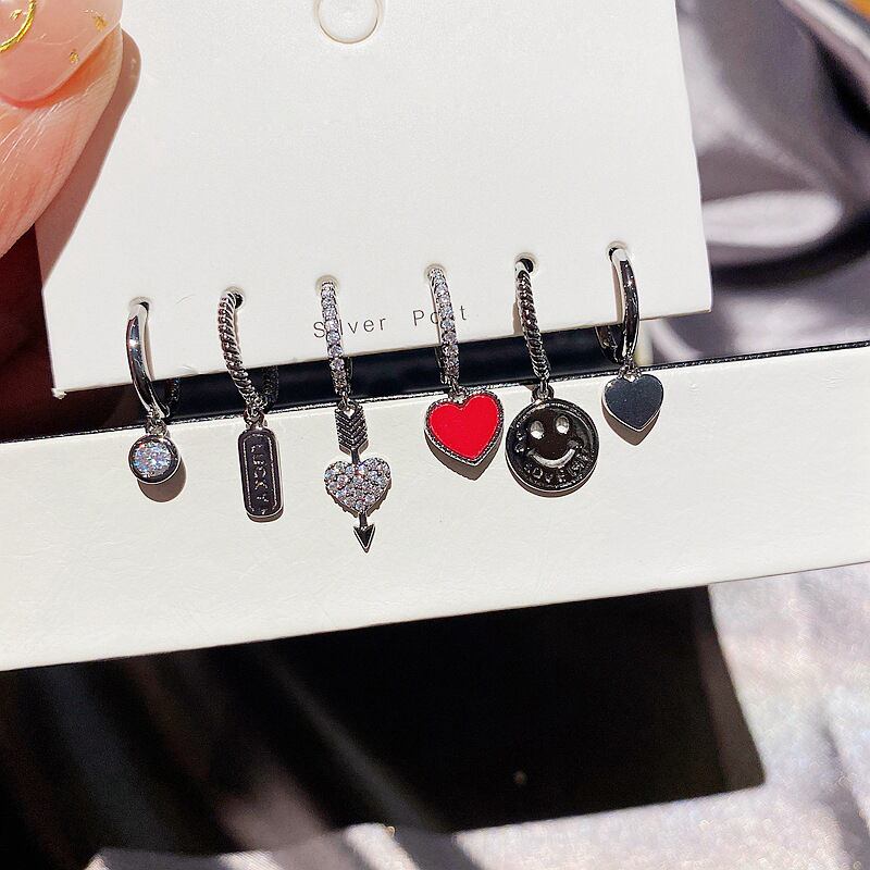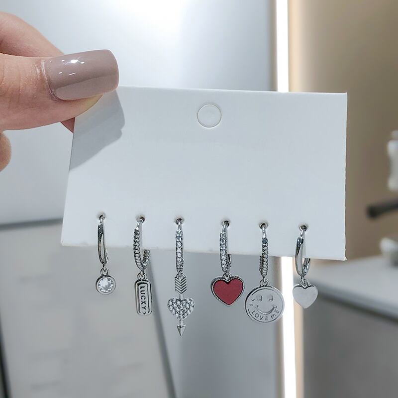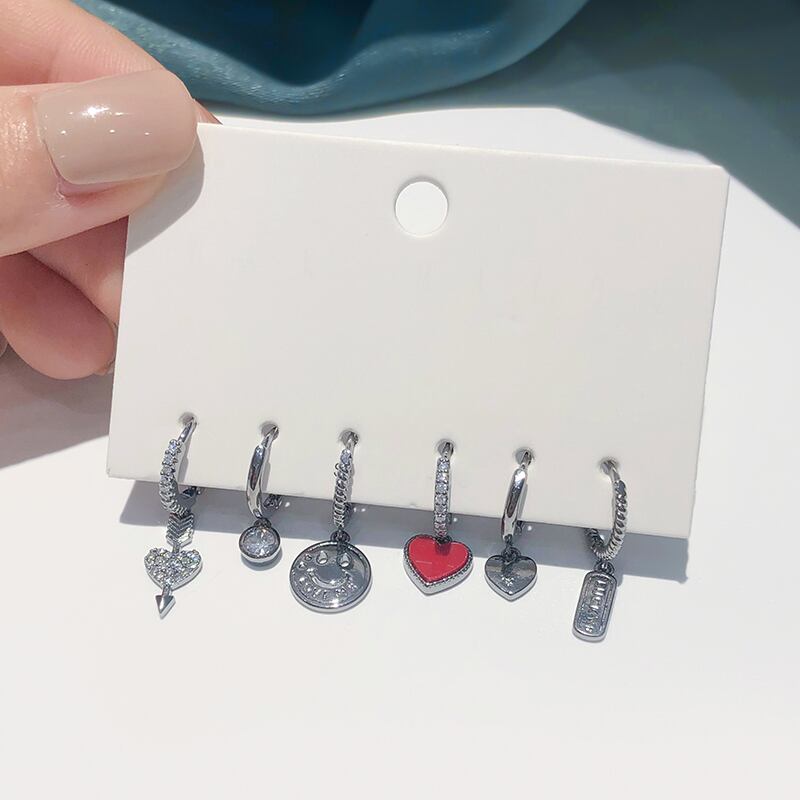 送料無料 ANENJERYシルバーカラーカッパースマイリーラブハートラッキーフープピアスレディースパーソナルクール6ピースピアスセット イヤリング リング 指輪 銀 アクセサリー AE165549211675754