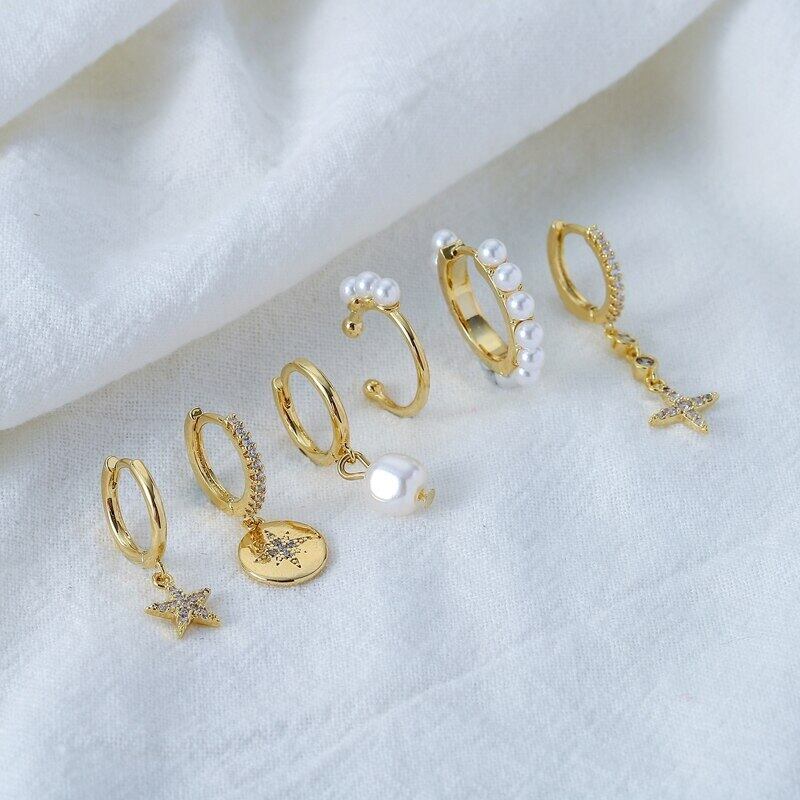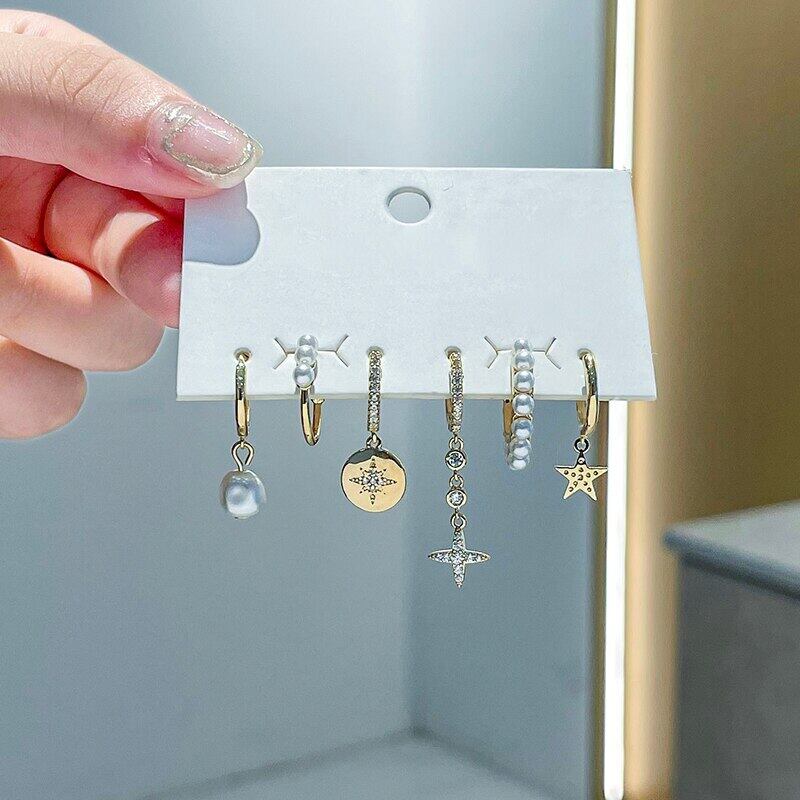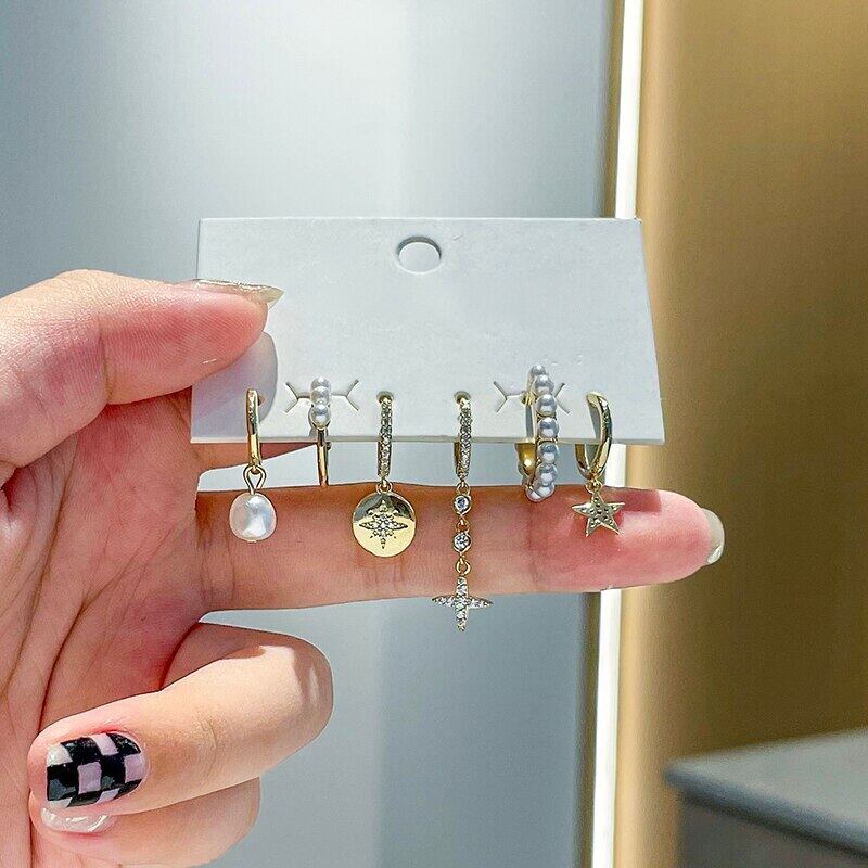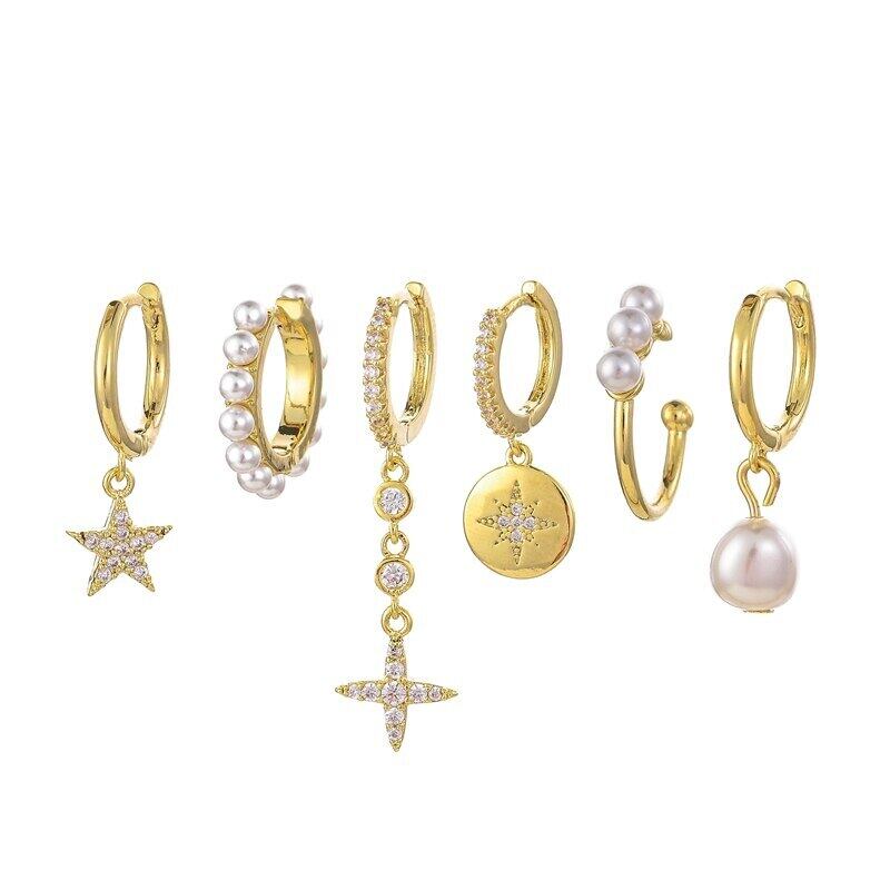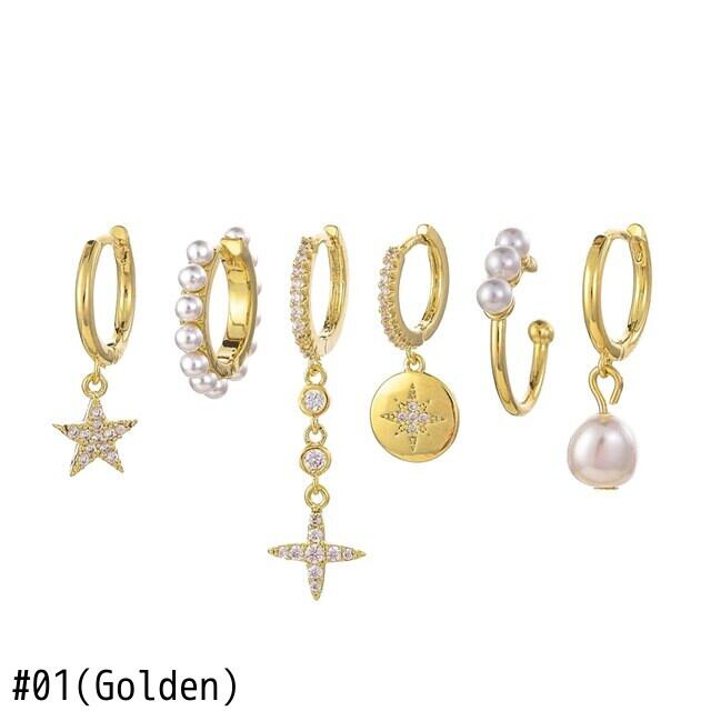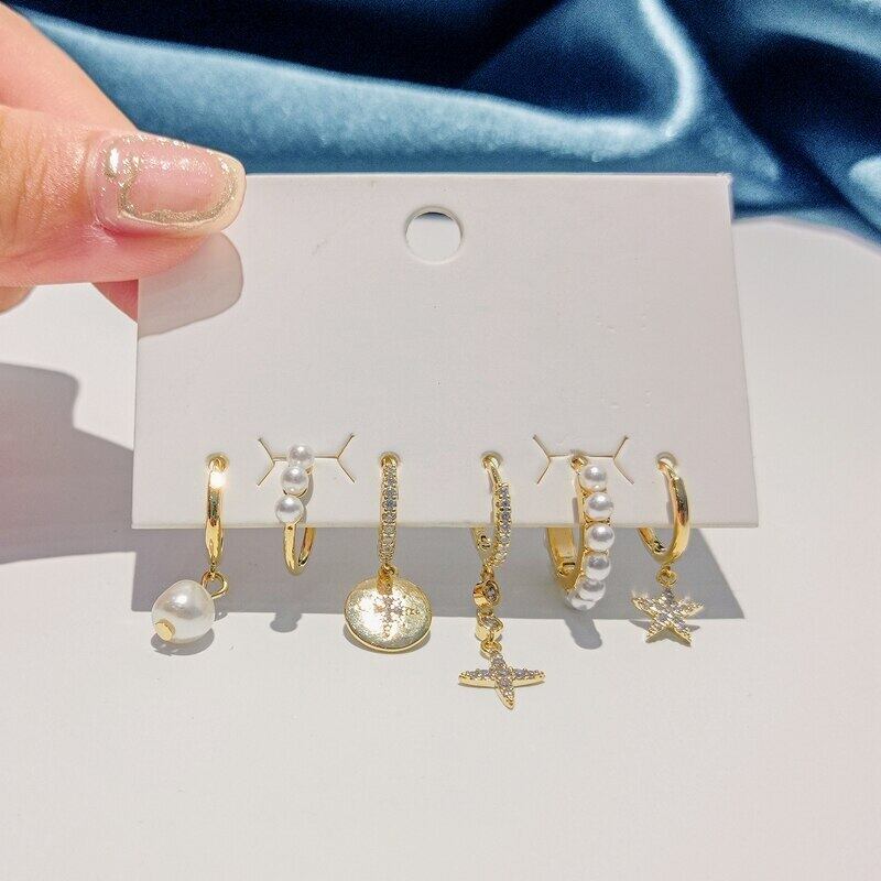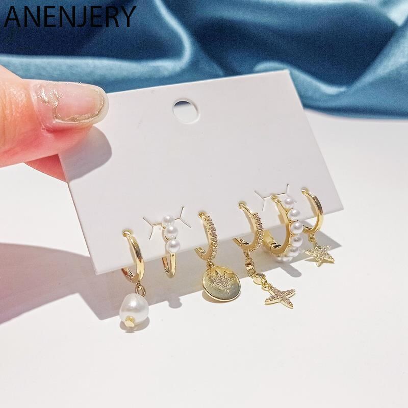 送料無料 ANENJERYシルバーカラージルコンスターテルパールクリップフープゴールデンウーマン6ピースイヤリングセット 真珠 銀 アクセサリー AE165525338626227