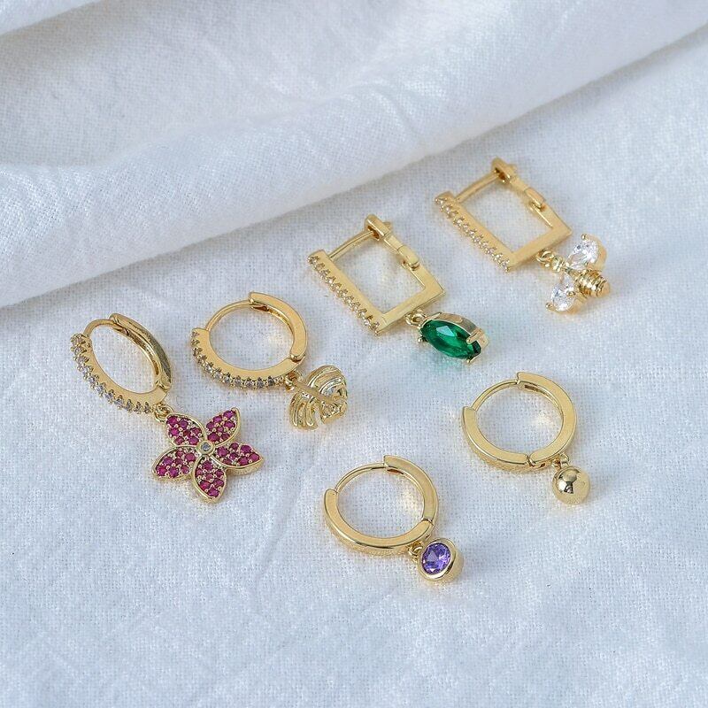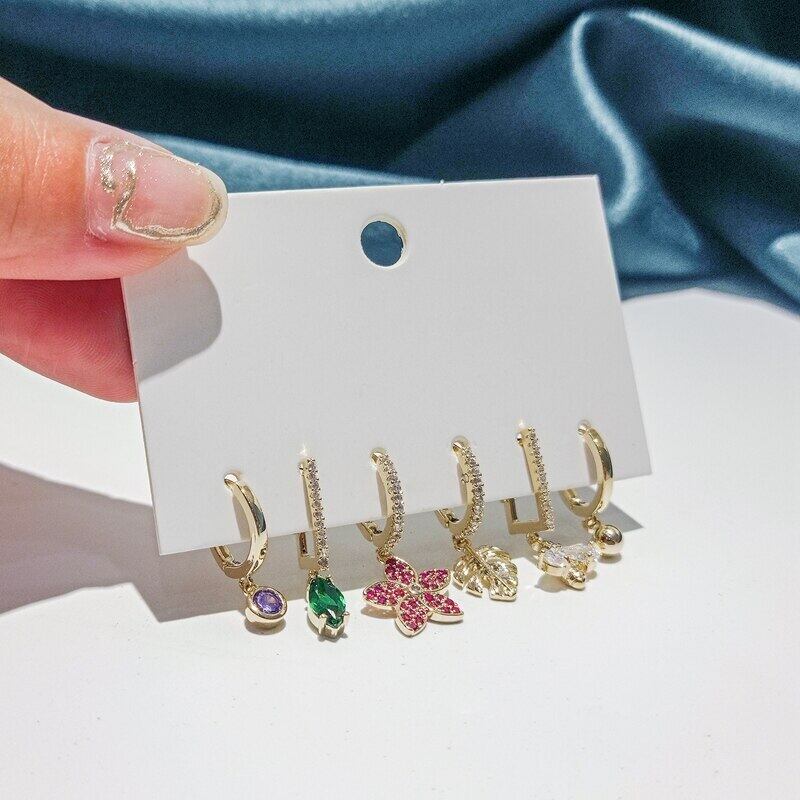 送料無料 ANENJERY6個/セットシルバーカラー銅色ジルコン昆虫の葉フラワーフープピアスセット女性かわいいパーティージュエリー レッド イヤリング 大人ガーリー スウィート キュート カジュアル リング 指輪 フラワーデザイン 銀 アクセサリー AE165520575973095