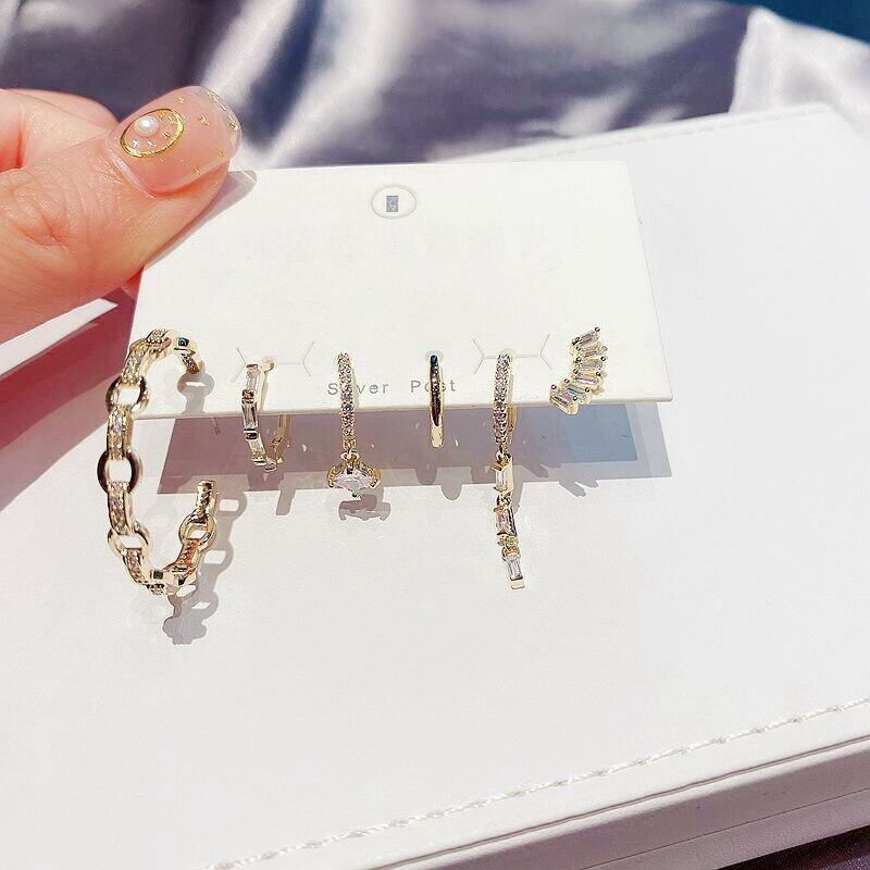 送料無料 ANENJERYシルバーカラーフープピアスセットレディース幾何学的高級ジルコン6ピースピアスセットジュエリー2022 イヤリング リング 指輪 銀 アクセサリー AE165581696297434