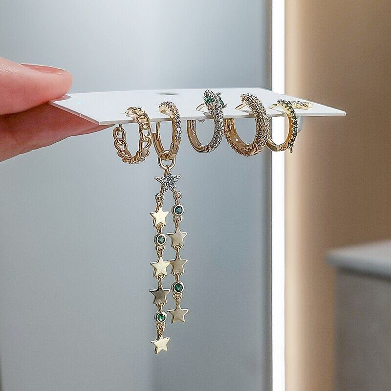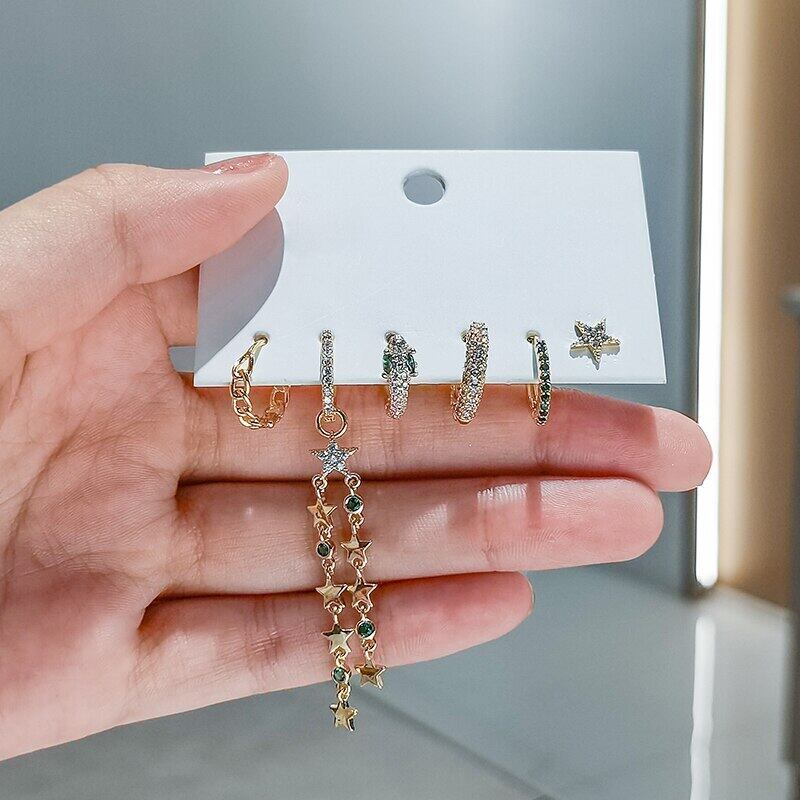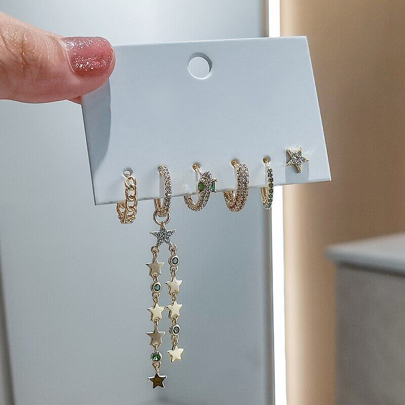 送料無料 ANENJERY6個/セットシルバーカラースターチェーンシェイプフープピアスセット高級ジルコンハンドメイドピアスパーティージュエリー イヤリング リング 指輪 銀 アクセサリー AE165552193157111