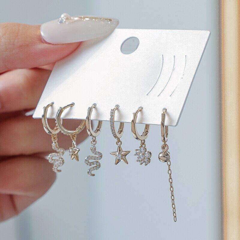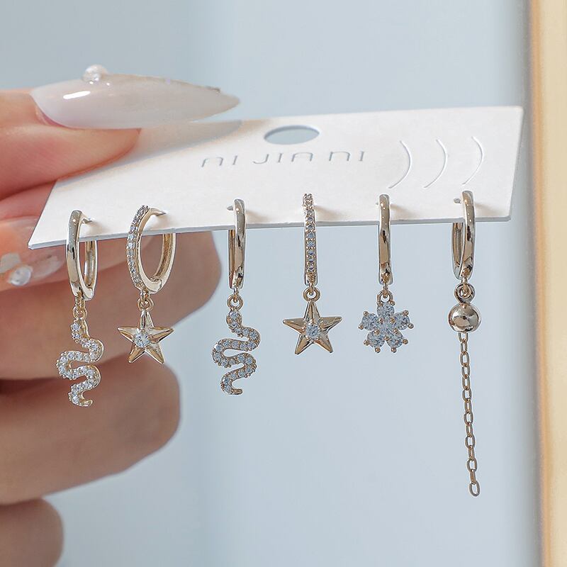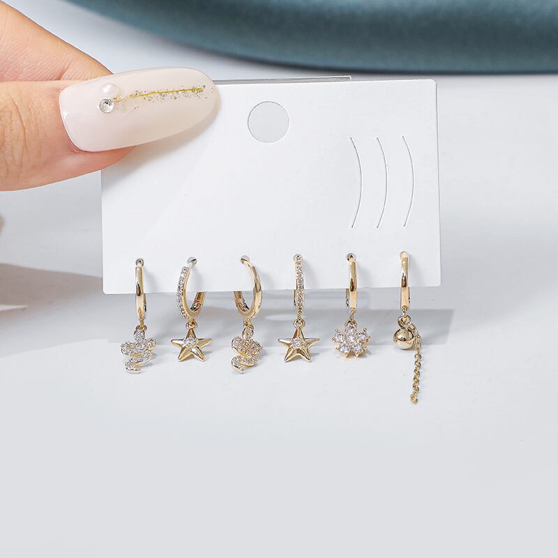 送料無料 シルバーカラーカッパージルコンスネークスターフラワーチェーンテルフープピアスレディーストレンディ6ピースピアスセット イヤリング リング 指輪 フラワーデザイン 銀 アクセサリー AE165547881246068