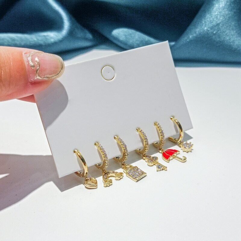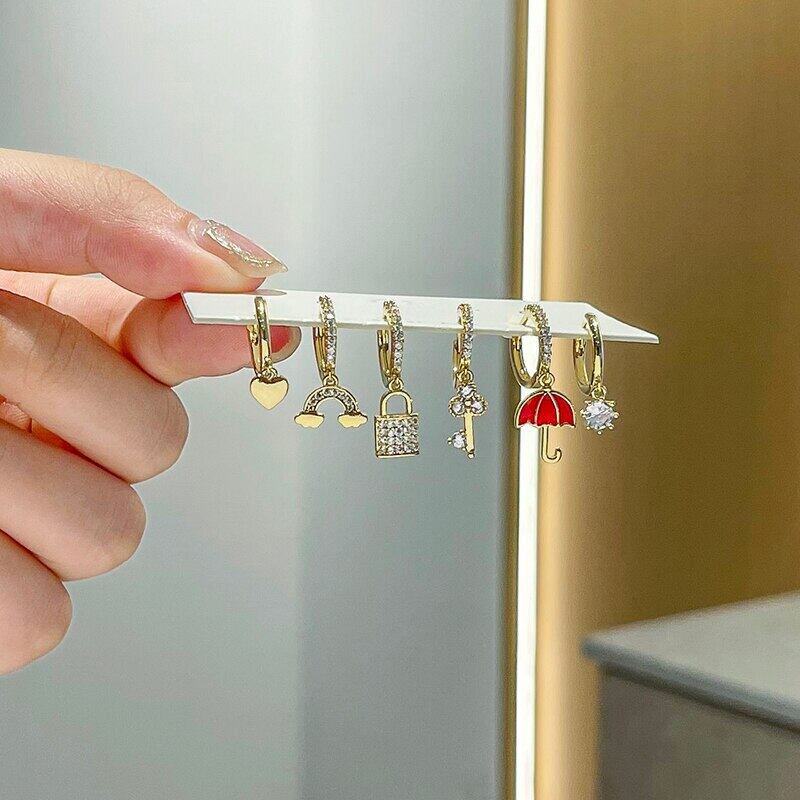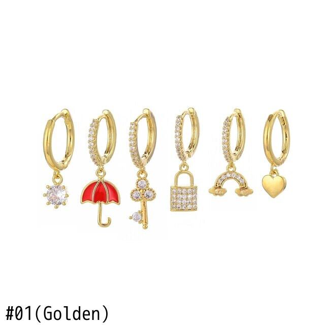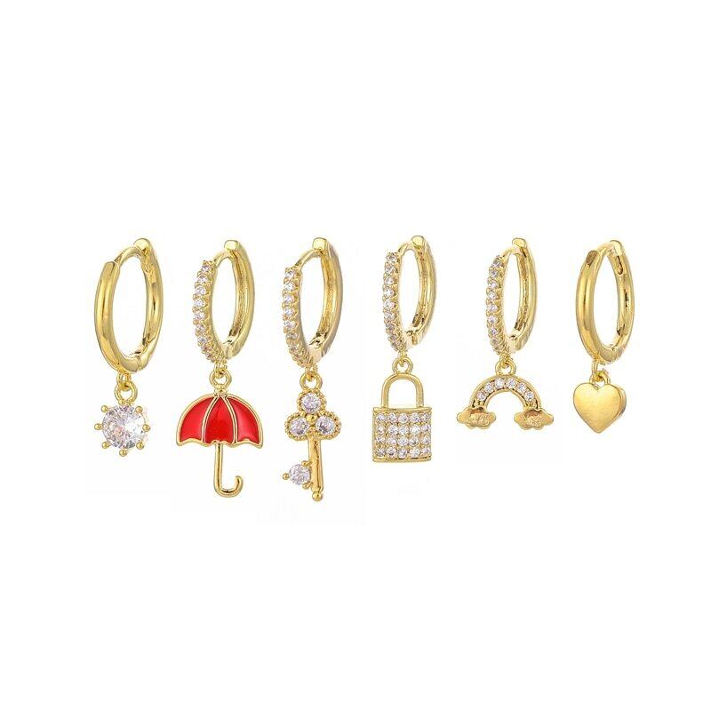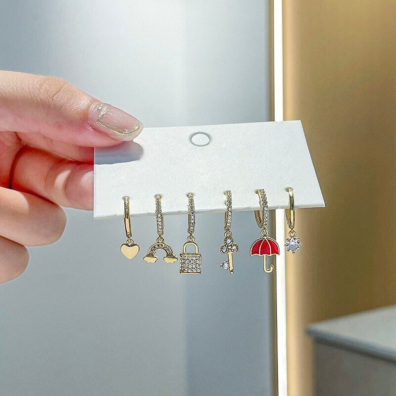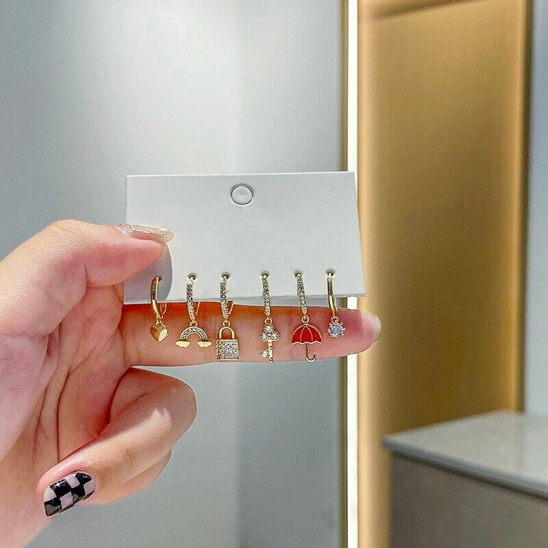 送料無料 ANENJERY6点/セットシルバーカラージルコン傘キーロックフープピアスラグジュアリーゴールデン6点ピアスセット イヤリング リング 指輪 銀 アクセサリー AE165568585822592