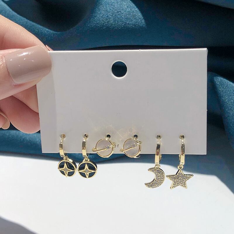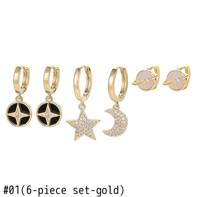送料無料 ANENJERYシルバーカラーカッパーストーンプラネットジルコンスタームーンイヤリングレディースクールシンプル6点セットイヤリングガールジュエリー 指輪 銀 アクセサリー AE165520604377254