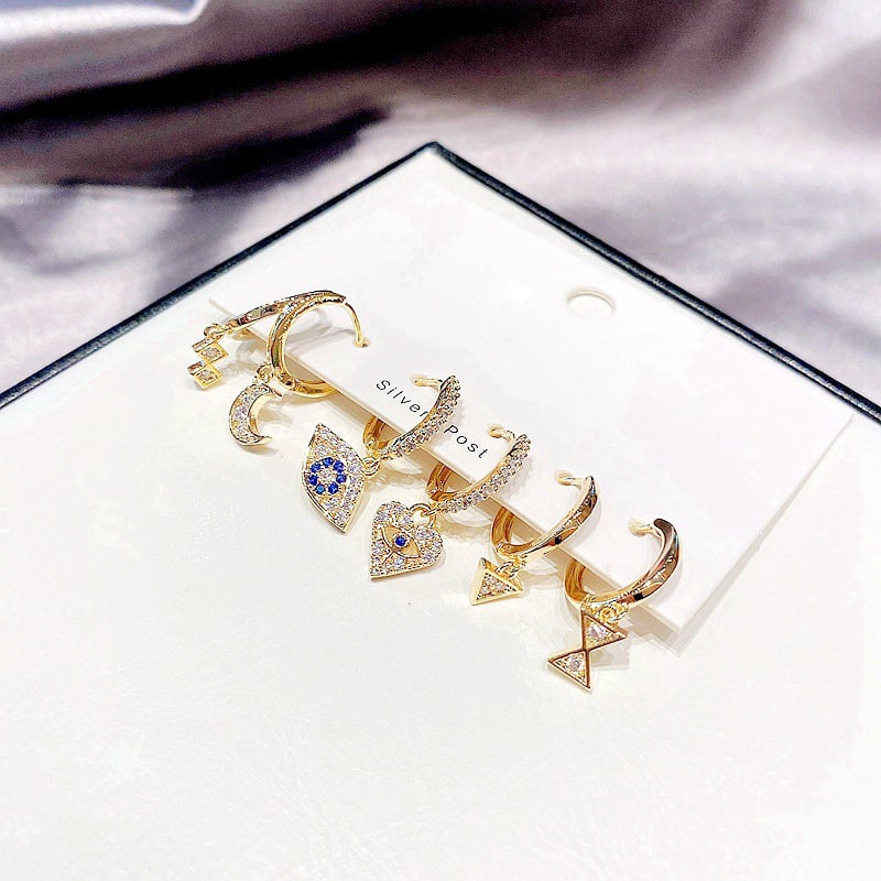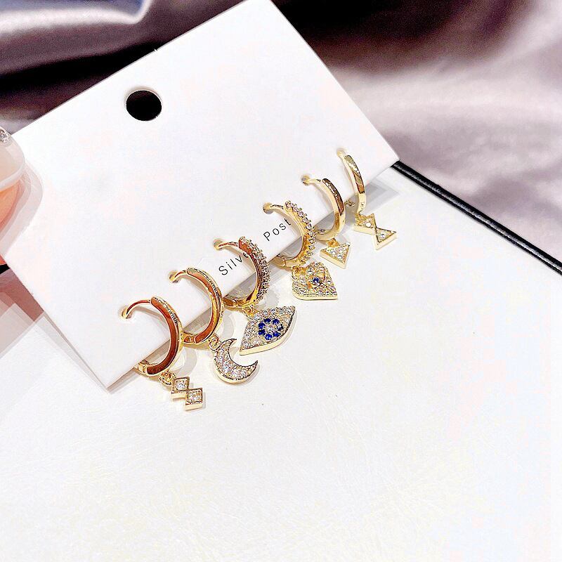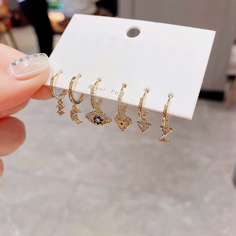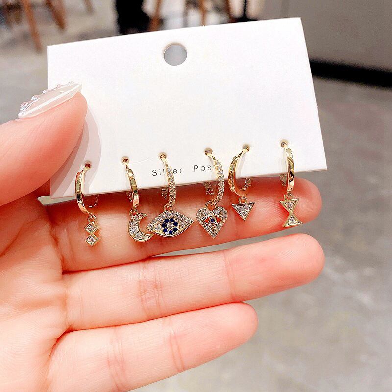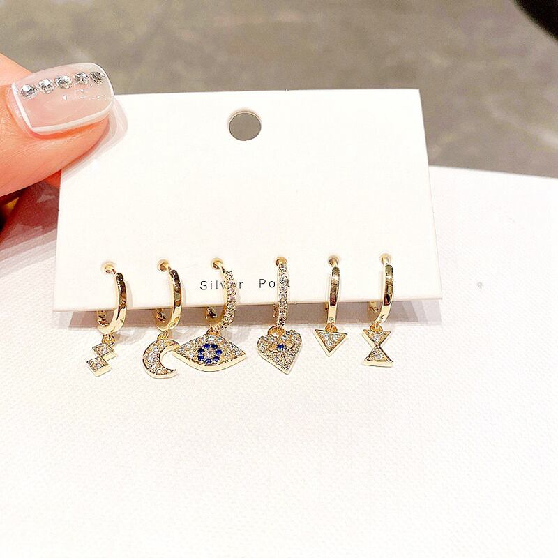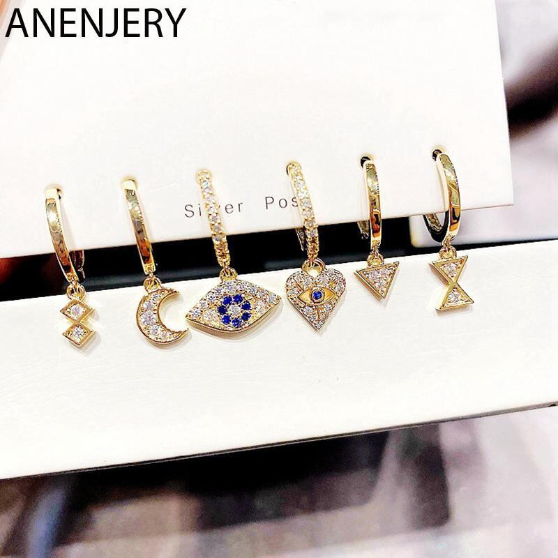 送料無料 ANENJERYシルバーカラー銅マイクロジルコン幾何学的ハートアイズムーンフープピアス女性パンクスタイル6ピースピアスセット イヤリング リング 指輪 銀 アクセサリー AE165529734314204