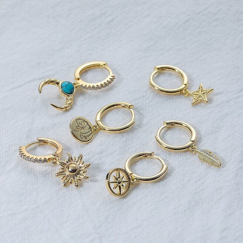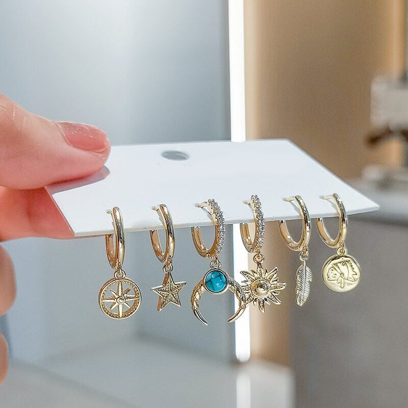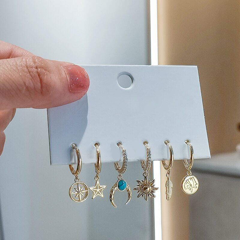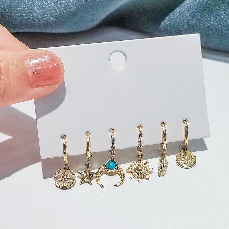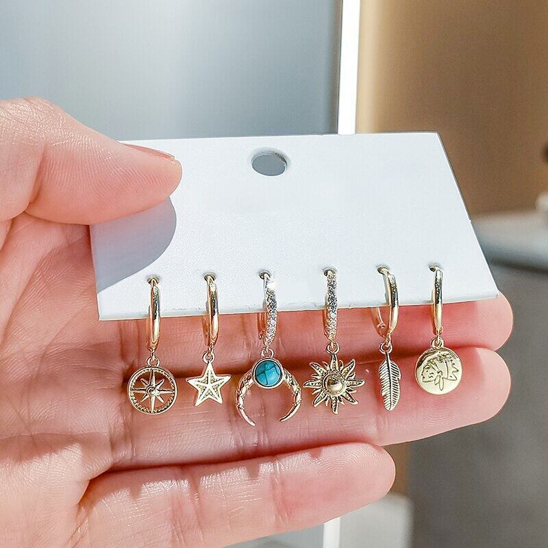 送料無料 ANENJERY6個/セットシルバーカラーカッパームーンサンスターリーフフープピアスセットマイクロジルコンオールマッチピアスレディース イヤリング リング 指輪 銀 アクセサリー AE165584764537161