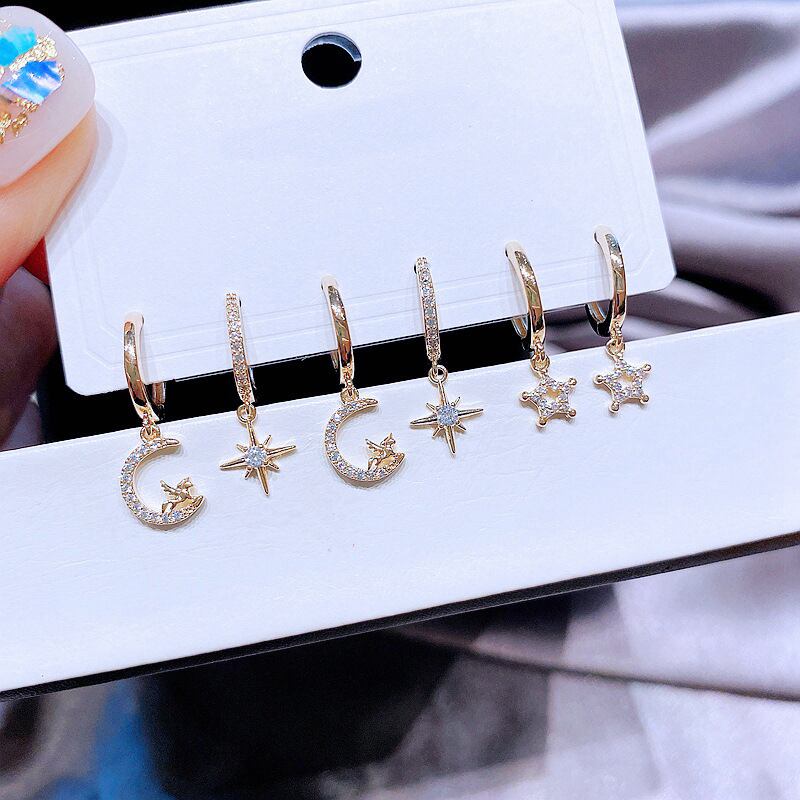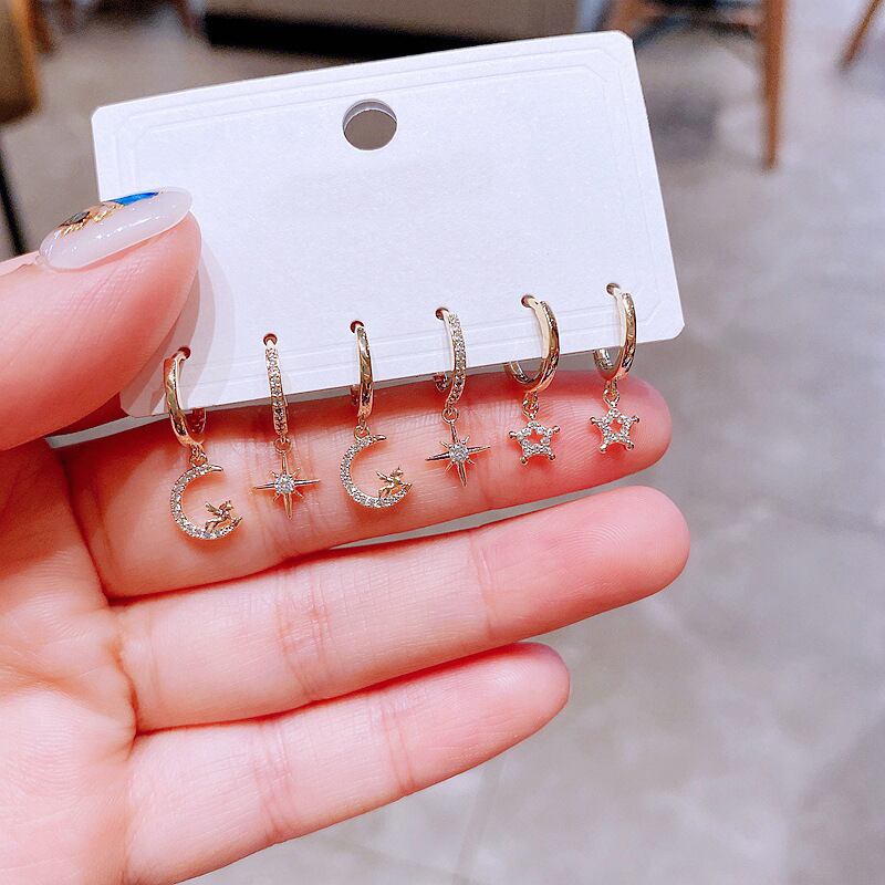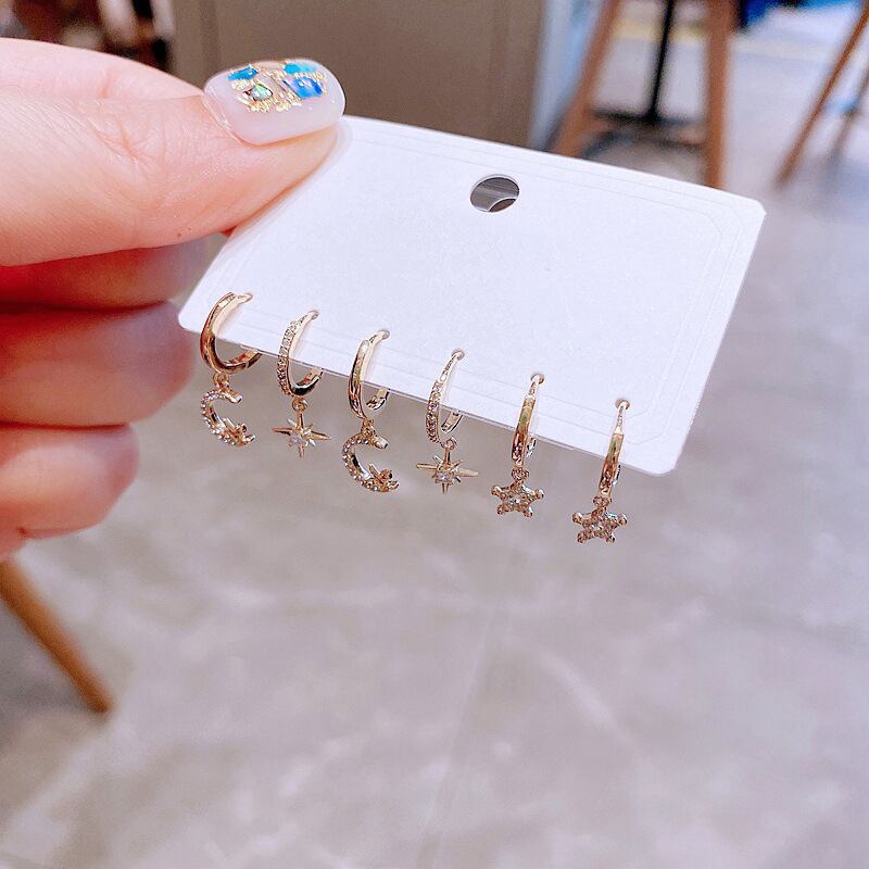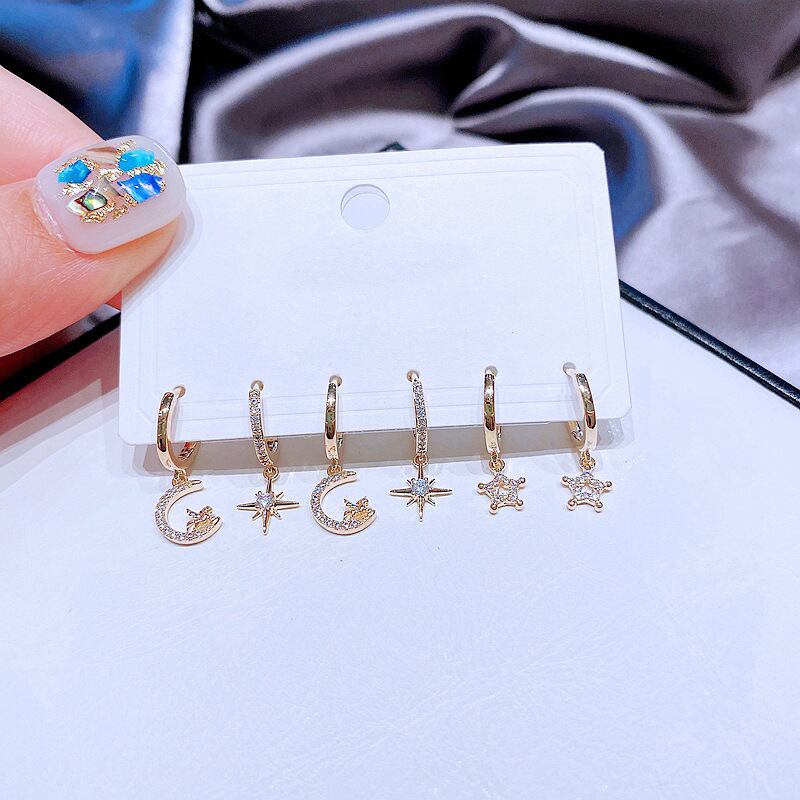 送料無料 ANENJERYシルバーカラー銅ジルコンスタームーンペガサスフープピアス女性漫画夢のような6ピースピアスセットホリデーギフト イヤリング リング 指輪 銀 アクセサリー AE1655892943969